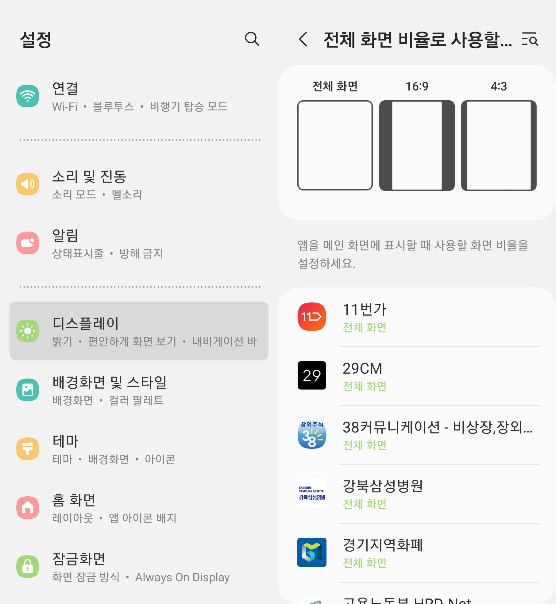 - "설정 > 디스플레이 > 전체 화면 비율로 사용할 앱"으로 들어갑니다.