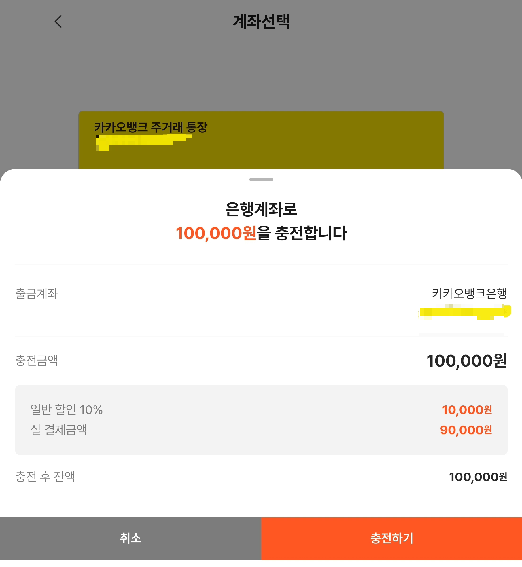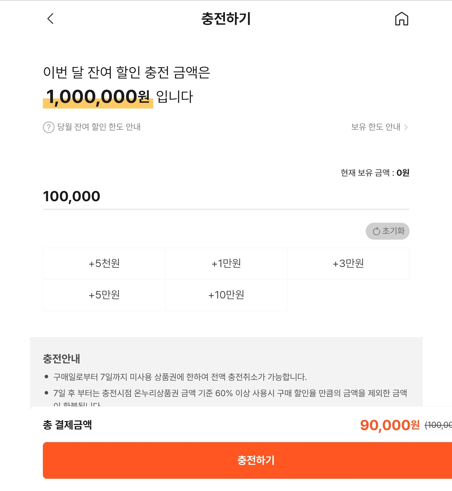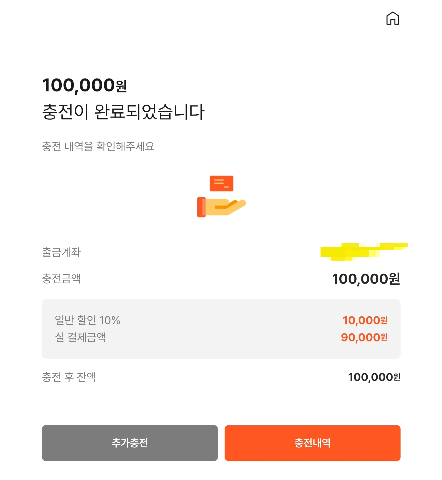 실제 입금 금액은 9만원과 할인된 금액(10%)인 1만원을 더해 10만원이 충전됩니다.