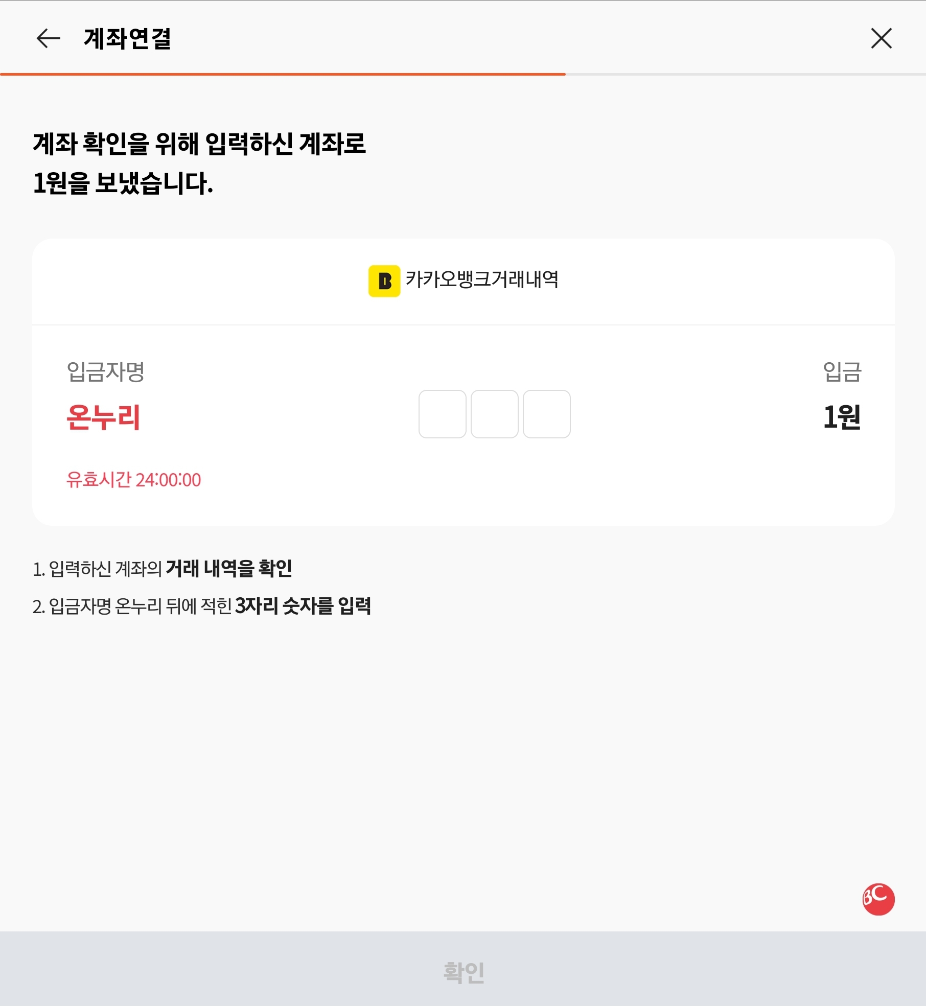 7. 계좌 확인을 위해 제 계좌로 1원을 넣어주는데, 입금자명에 붙어있는 번호를 입력합니다.