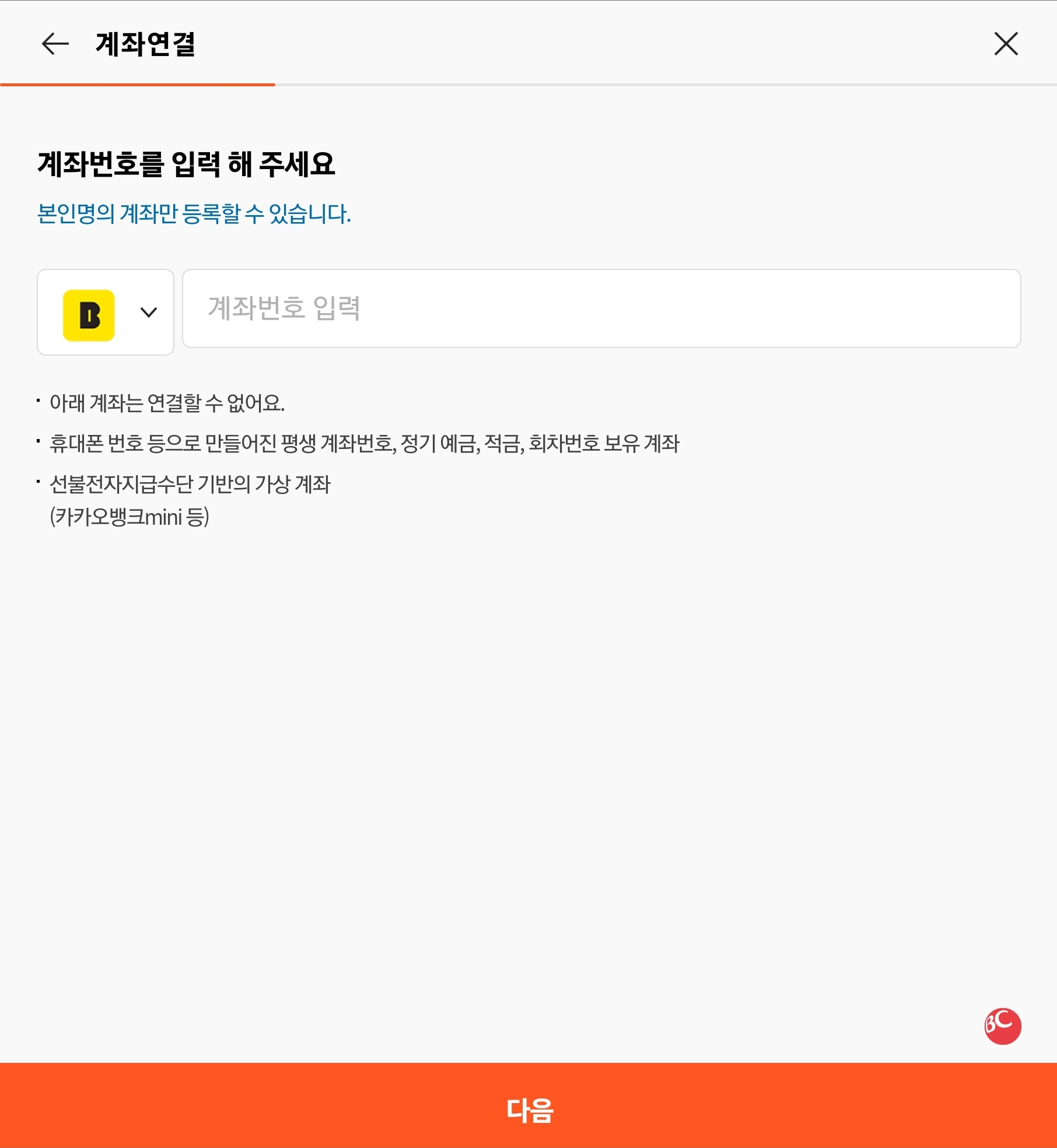 5. 처음으로 충전하는 경우 어디서 충전해줄지 계좌 연결이 필요합니다. 은행과 계좌번호를 입력하고 다음을 눌러줍니다.