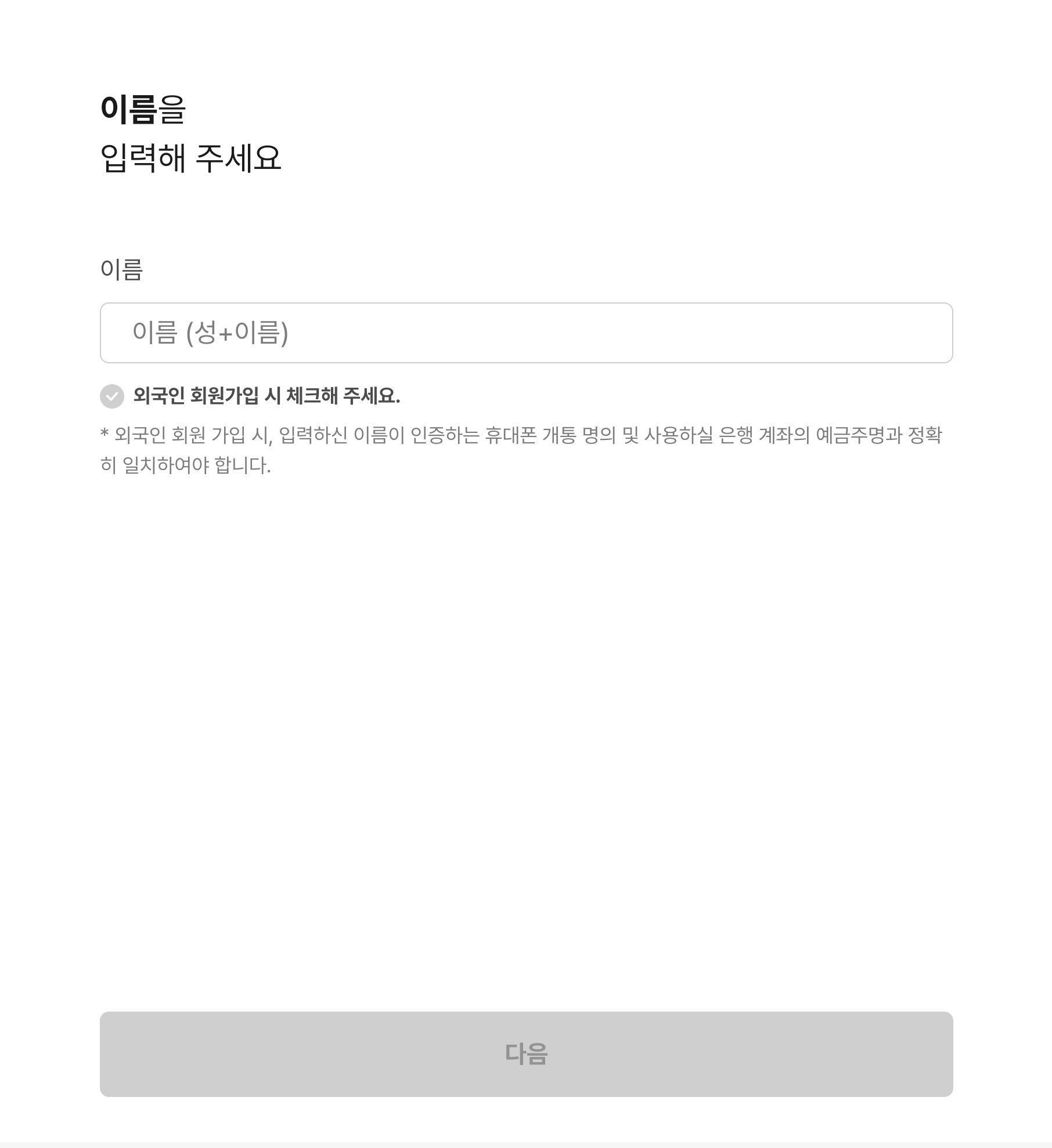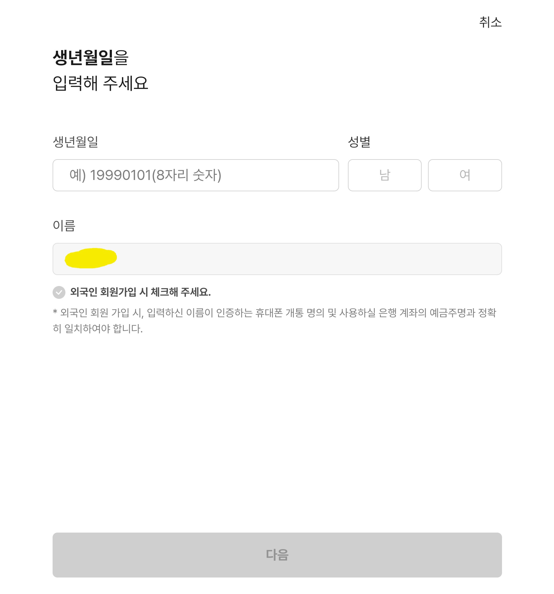 2. 본인의 생년월일(8자리) > 성별 > 이름을 입력한 후 '다음'으로 넘어갑니다.