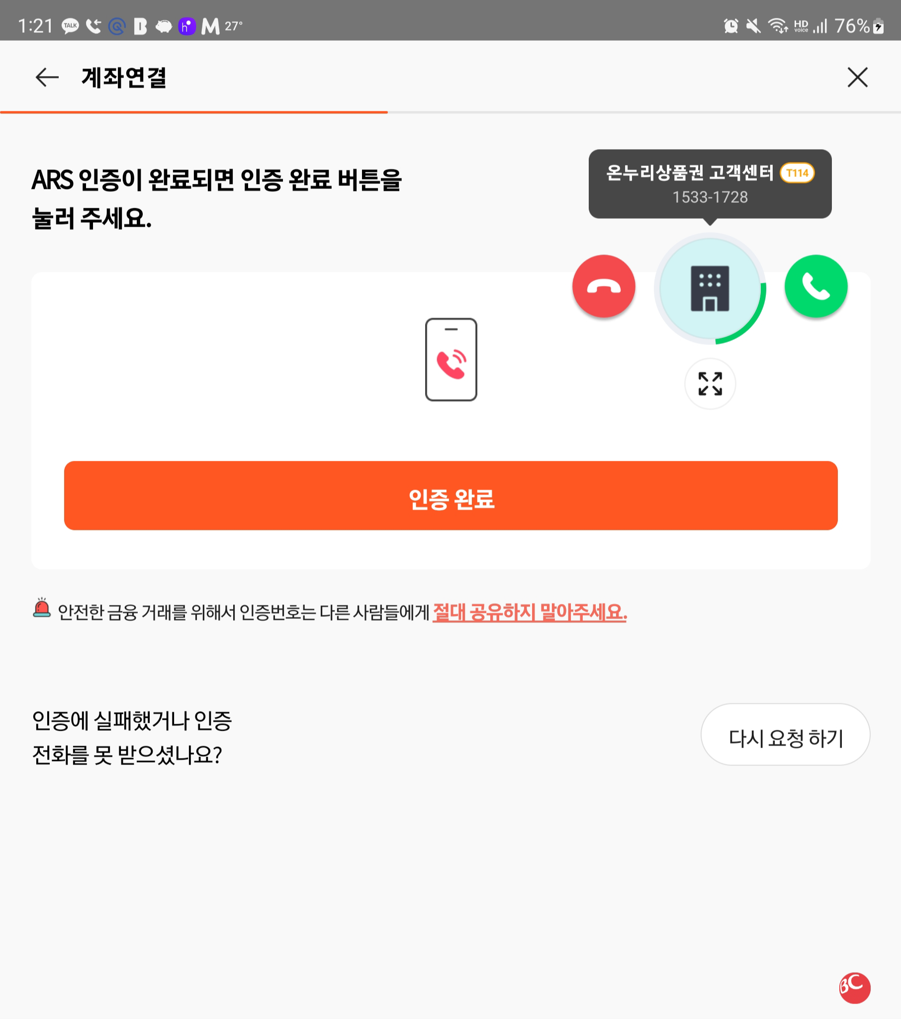 6. 본인 인증을 위해 계좌 연결하는 경우 ARS 인증을 요청합니다. 통화를 누른 후 음성에서 나오는 번호 3자리를 눌러줍니다.