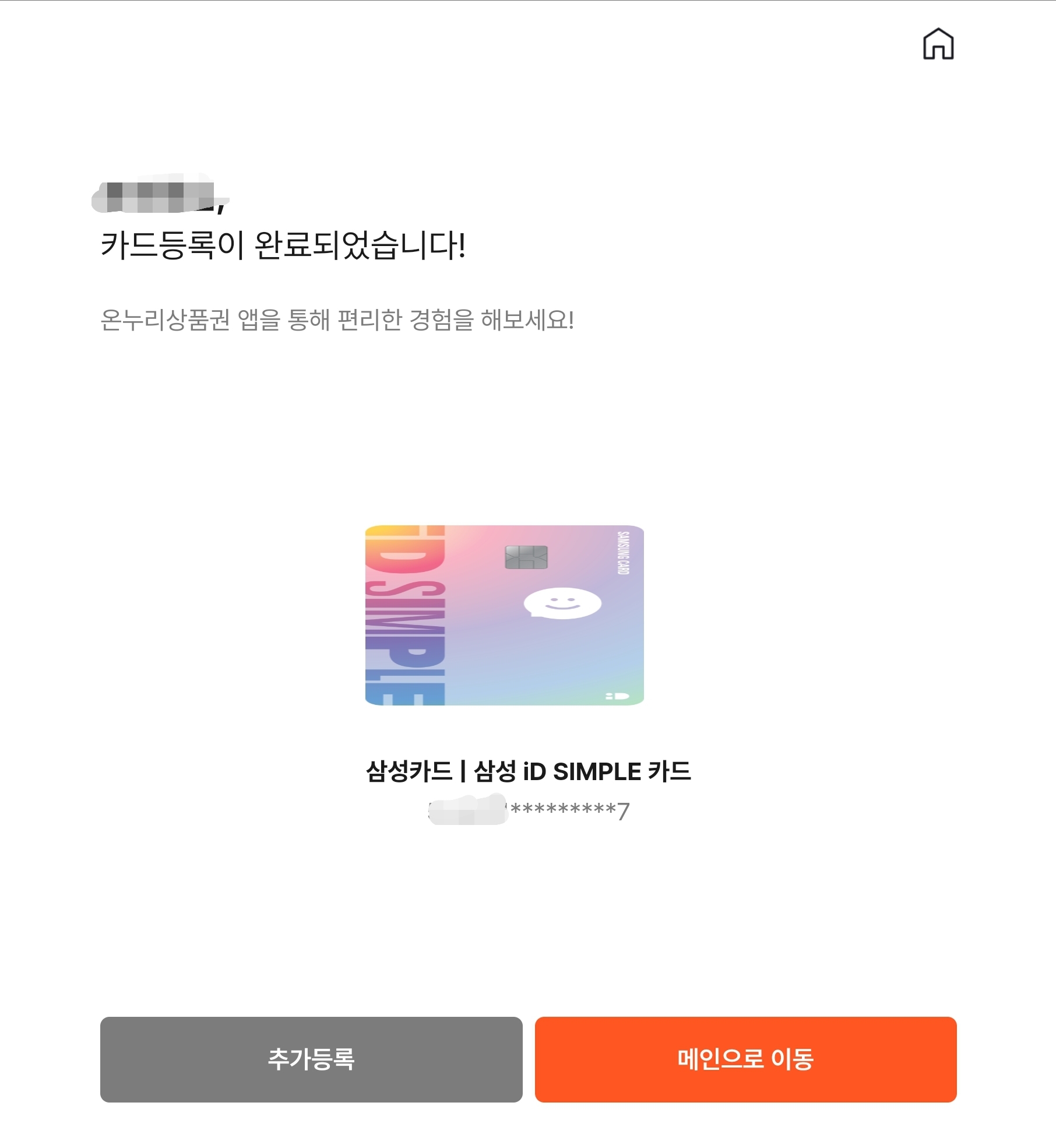 카드 등록이 완료하고 메인으로 돌아갑니다. 제가 가진 그 카드 모양 그대로 표시가 되네요.