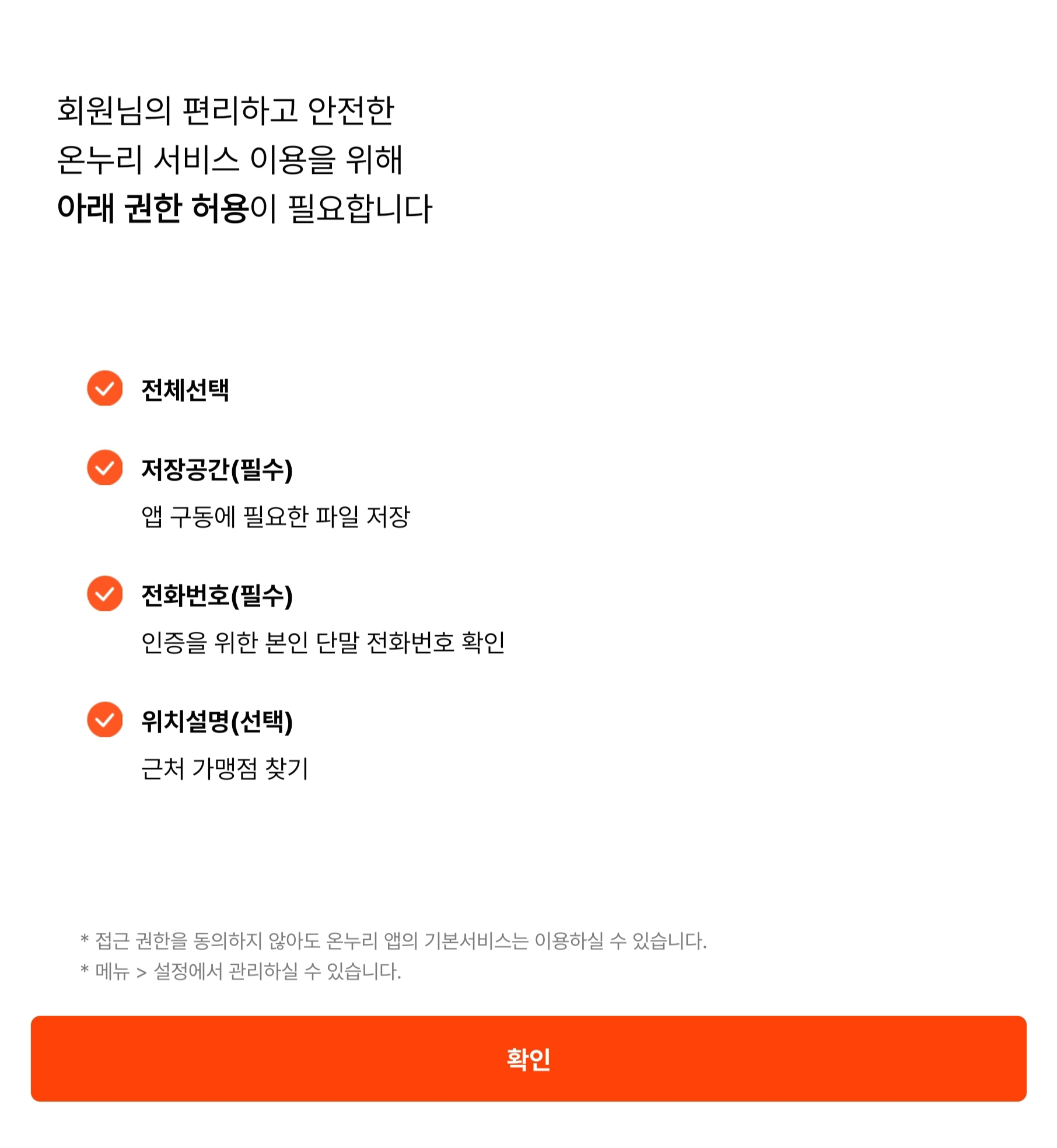 3. 앱을 동작시키는데 필요한 권한을 설정합니다. 위치는 선택항목이나 나중에 온누리상품권 가맹점 찾을 때 필요할 것 같아 같이 선택해줬습니다.
