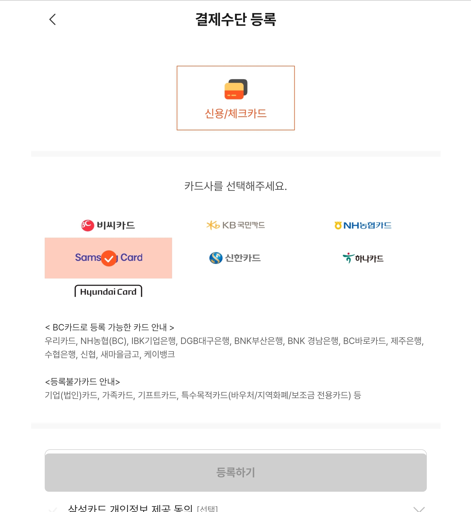 2. 카드 등록을 선택하고 카드 사를 선택해 줍니다.