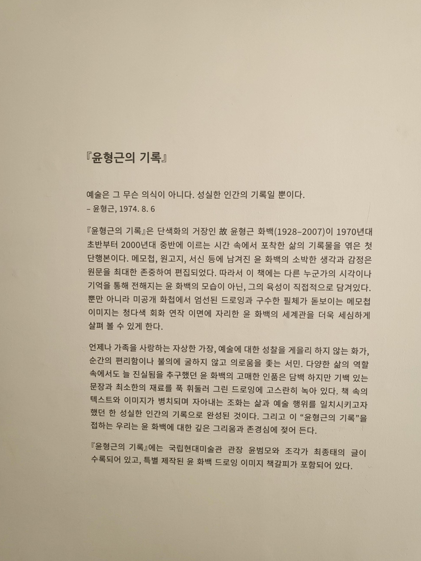 PKM 갤러리는 한국 단색화의 거목 故윤형근 화백 1928-2007 이 생전에 화첩, 메모첩, 서신 등에 남긴 소박한 기록들을 엮은 단행본 『윤형근의 기록』 (PKM BOOKS, 2021)의 출판을 기념하는 특별전을 개최한다. 윤 화백의 평소 생각과 생활 속의 감정들이 솔직담백하게 드러나는 『윤형근의 기록』이 더욱 울림 있게 대중에게 다가서기를 희망하며 기획된 본 전시에서는 단행본과 연관하는 미공개 드로잉 수십여 점과 초기작을 포함한 주요 회화, 편지·수첩·사진 등의 엄선된 아카이브 자료들이 일반에 최초로 소개된다.