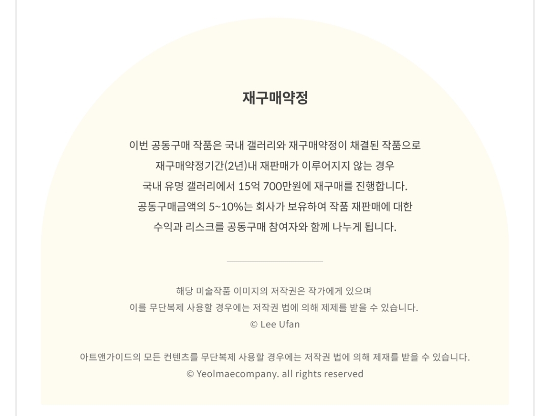 또한, 공동구매 가격의 5~10%를 아트앤가이드(열매컴퍼니)에서 보유함으로써 이 회사도 수익과 리스크를 어느 정도 감당하게 됩니다.