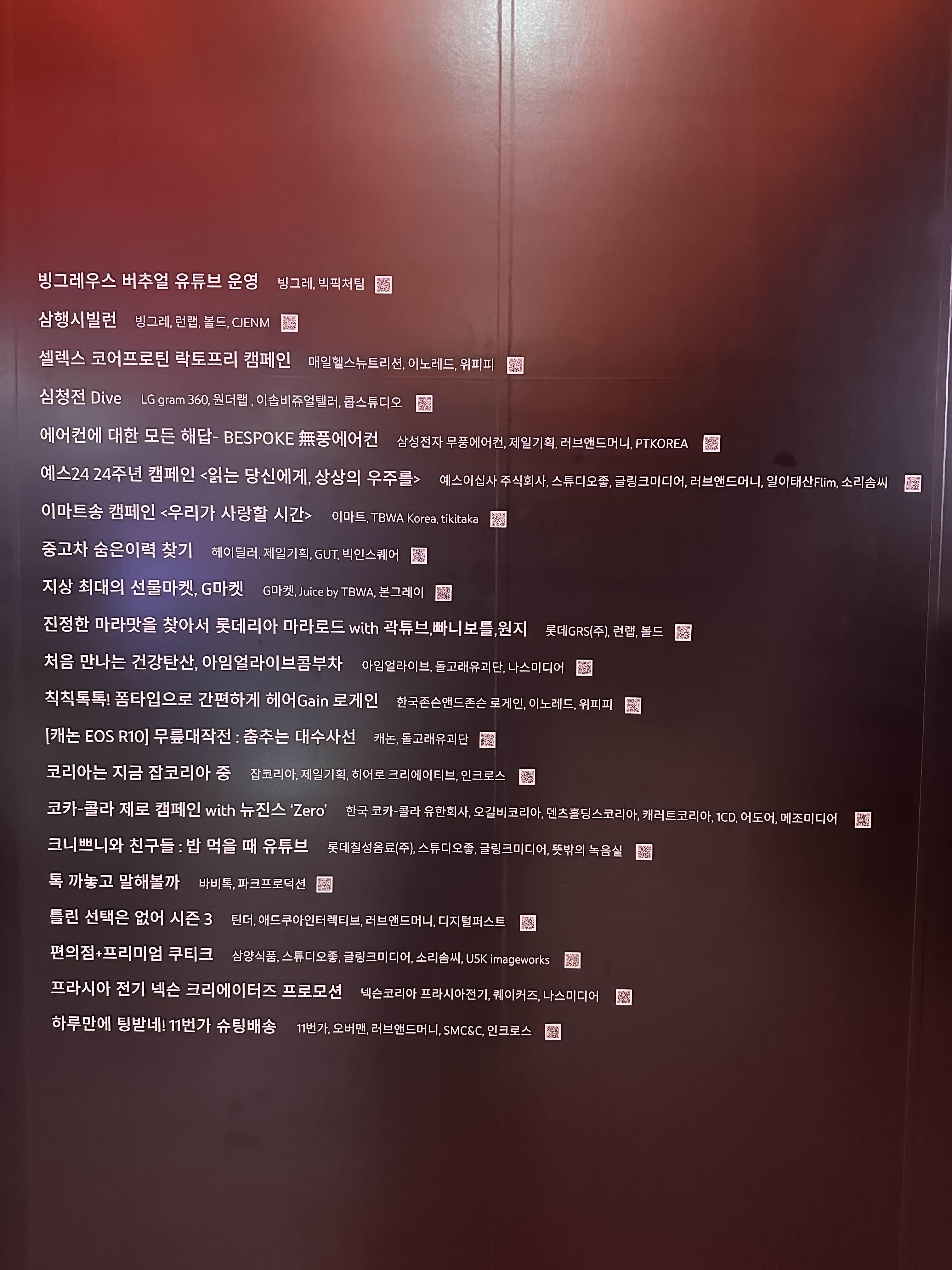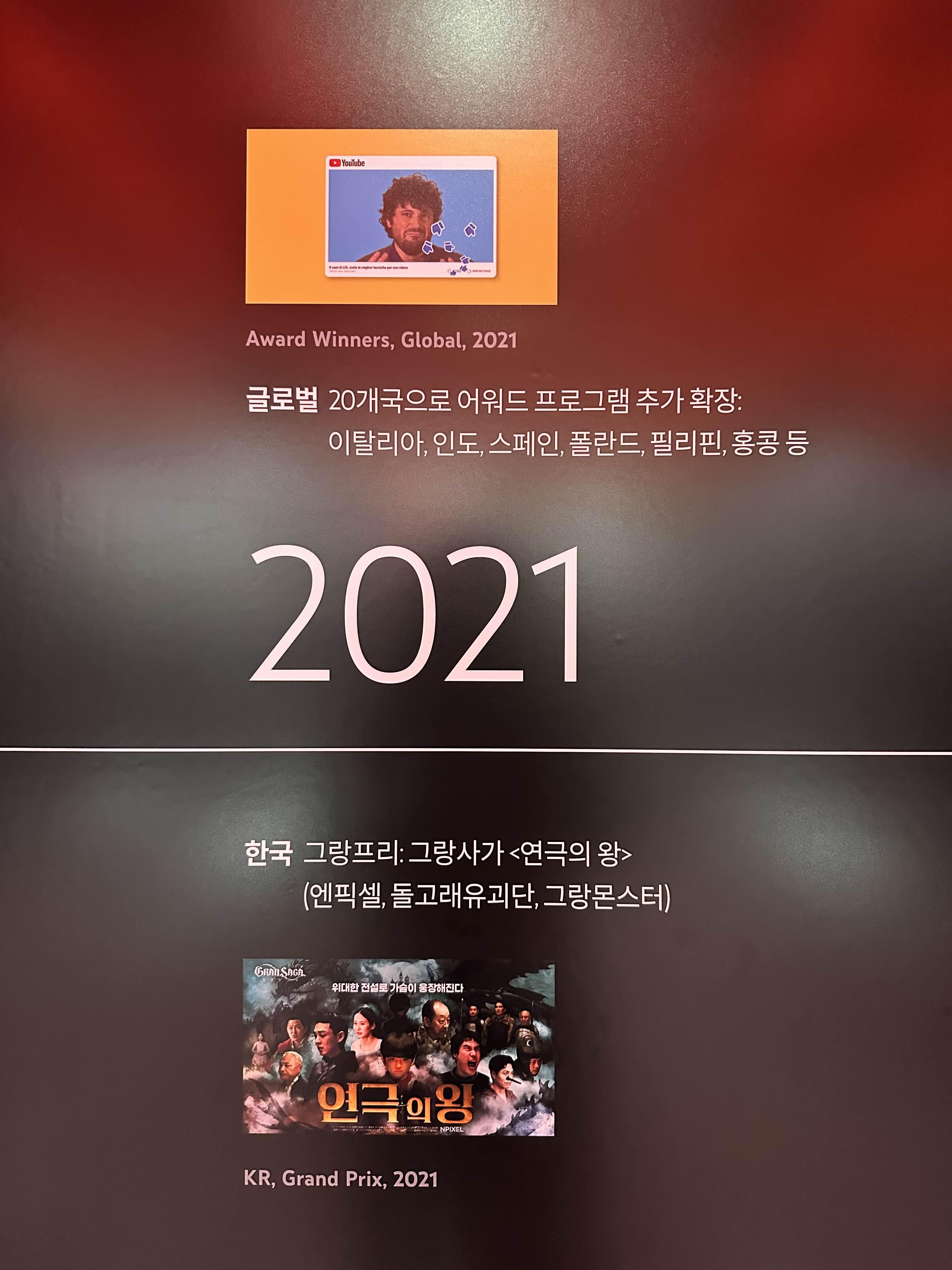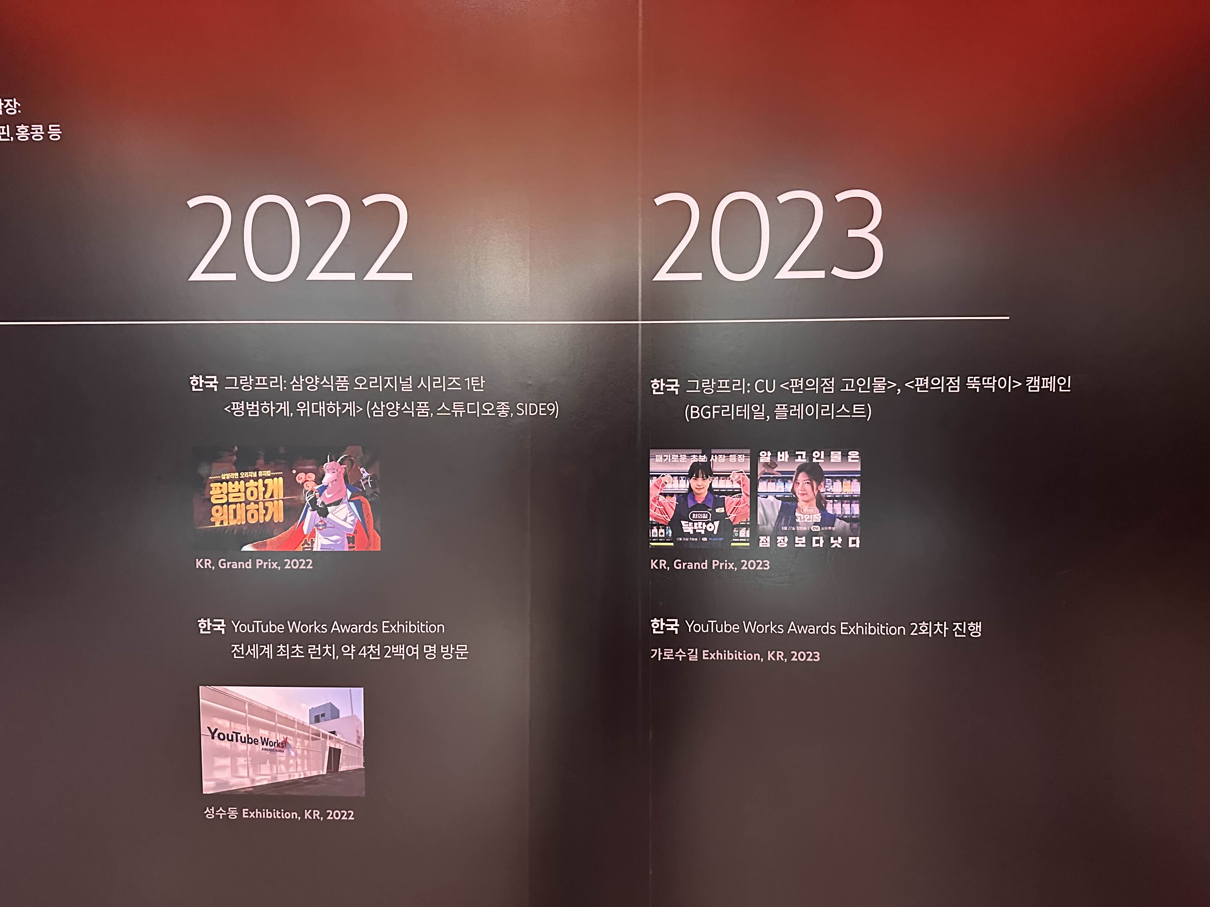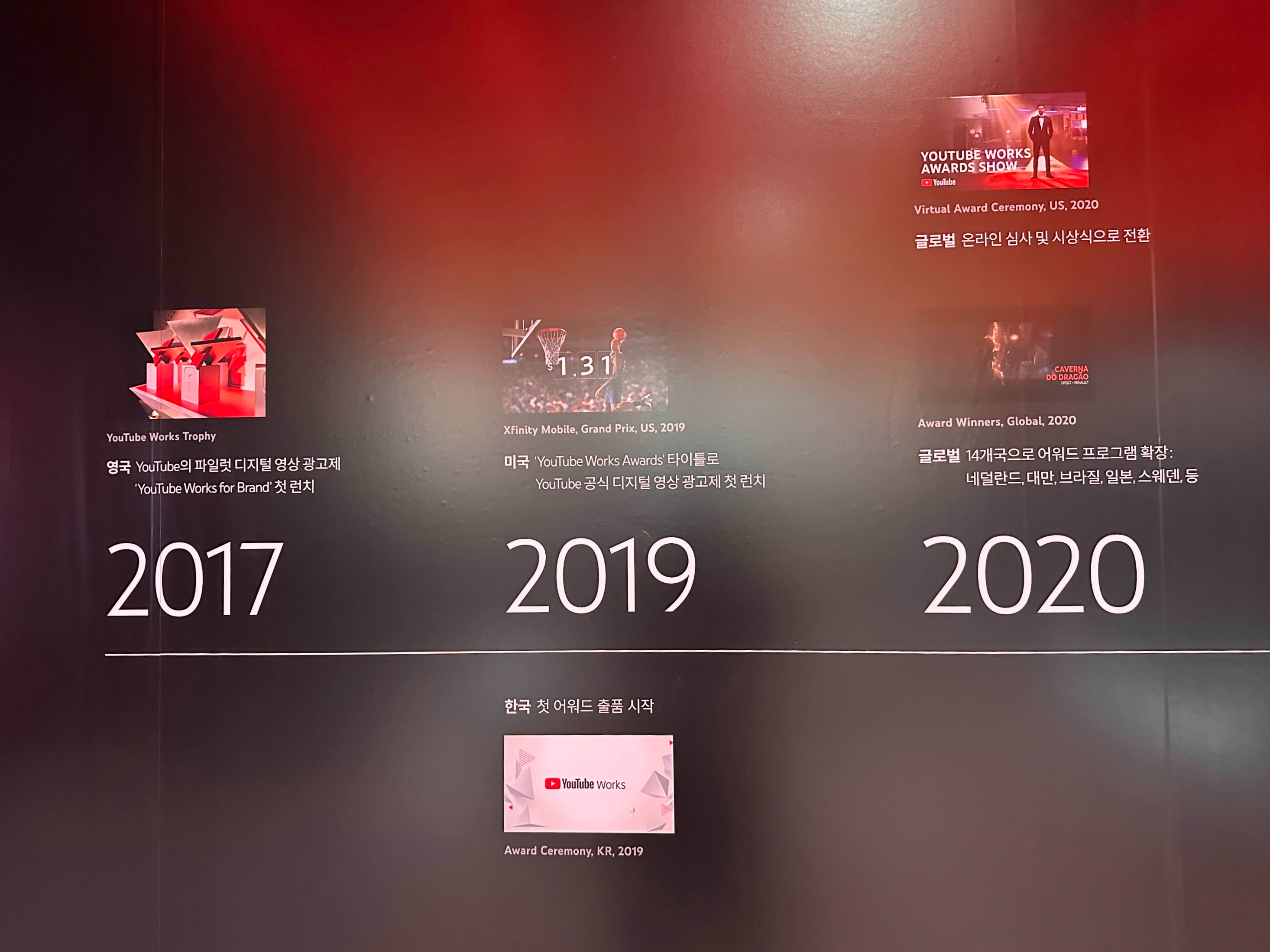 한쪽 벽면에는 유튜브 웍스 어워즈 광고 영상들을 모아두었습니다.