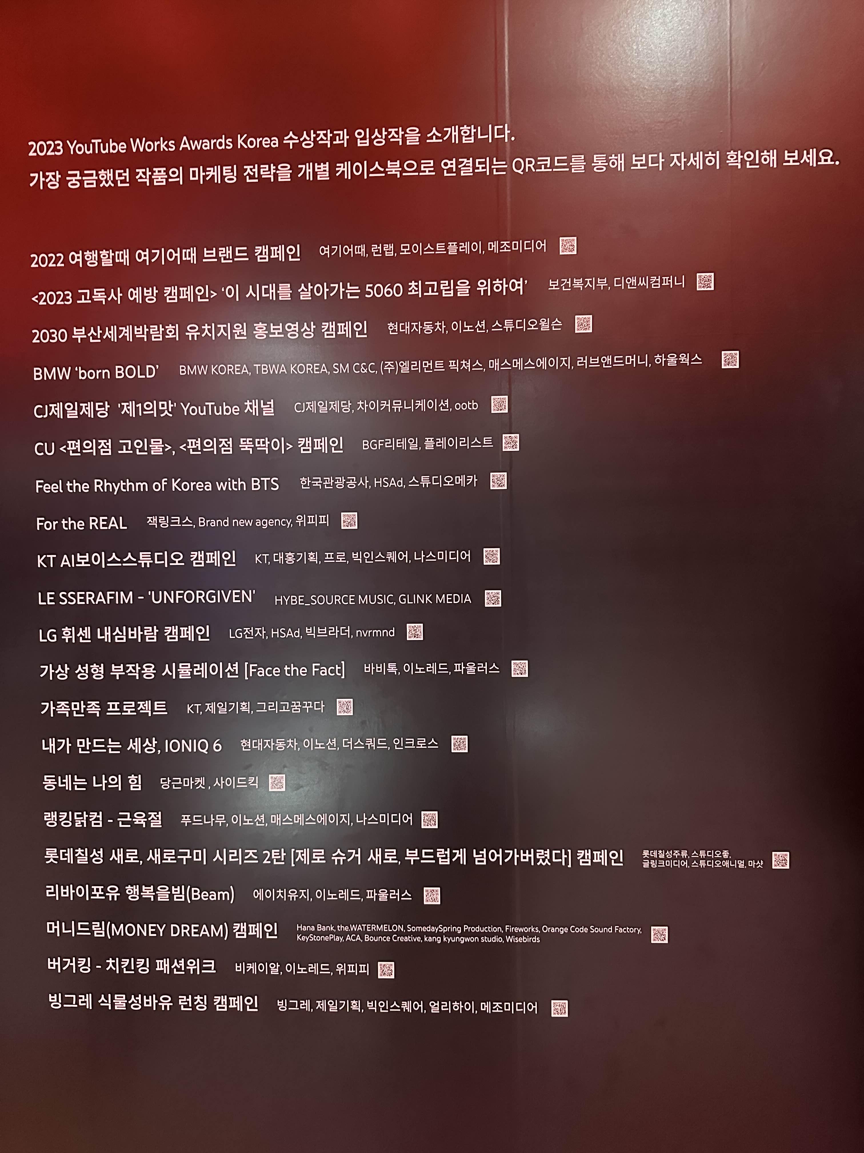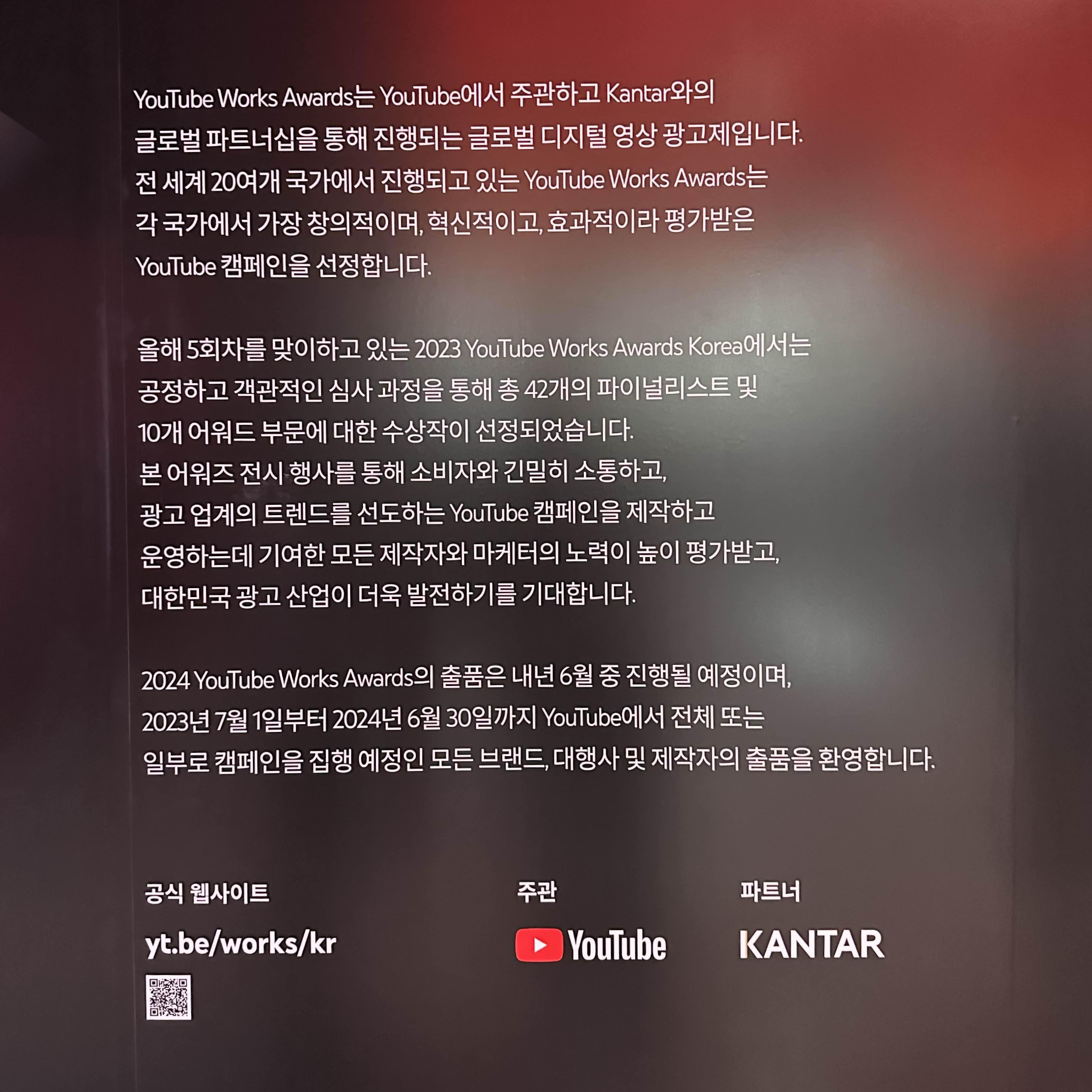 유튜브 웍스 어워즈는 매년 우수한 광고를 선정하여 시상하는 행사로 창의적인 광고 이외에도 유의미한 비즈니스 성과를 이룬 광고를 선정해서 마케터와 컨텐츠 제작자의 창의성을 높이는 도구로 활용되고 있다고 합니다.