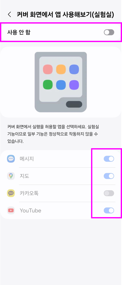 3) 사용 안 함을 사용으로 바꿔주고, 커버 화면에서 사용하기를 원하는 앱을 켜 줍니다.