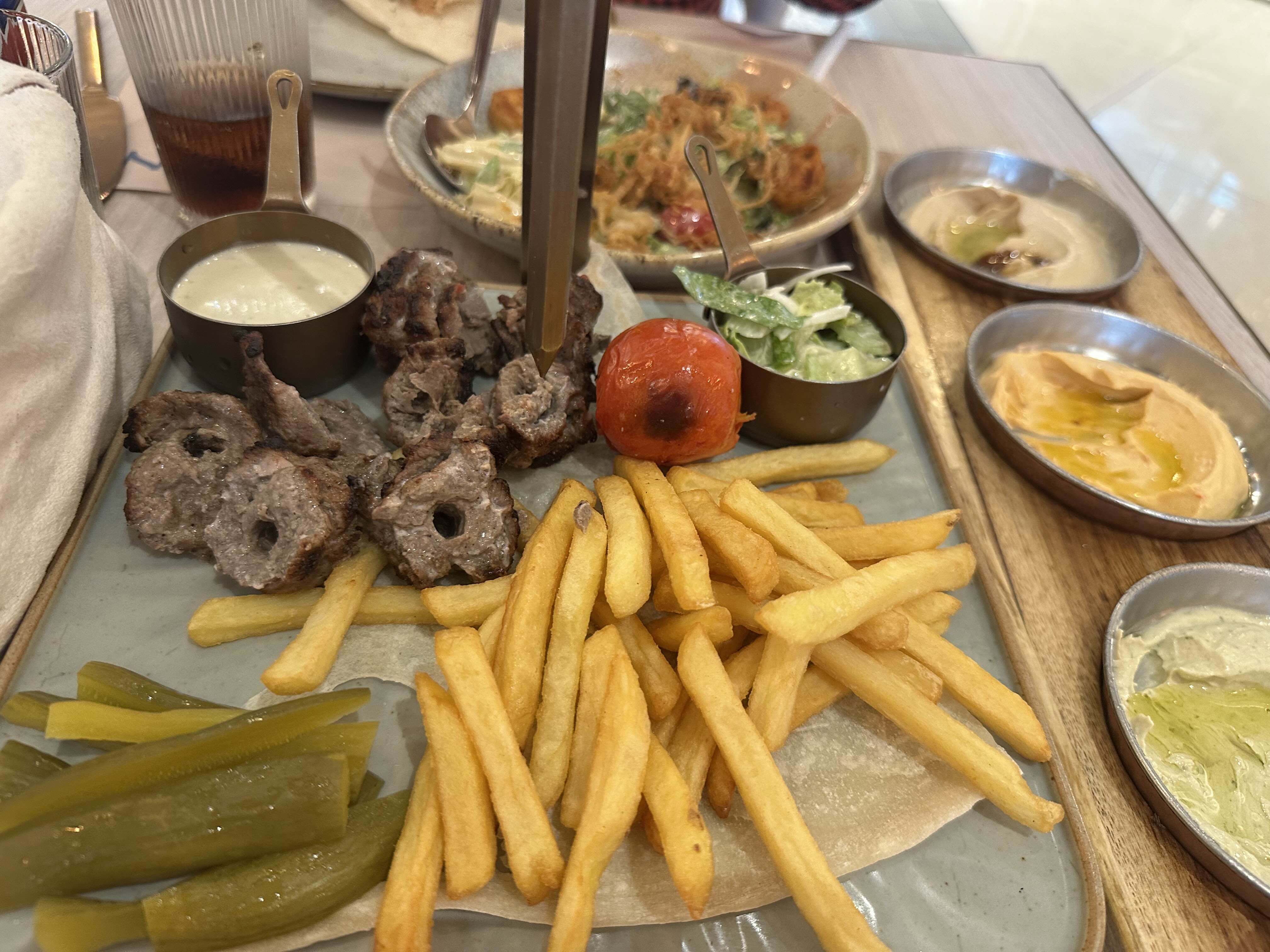 실내는 깔끔한 현대식이었고, 쉬림프 샐러드, 후무스, Awani Special Beef Skewer를 주문했습니다.