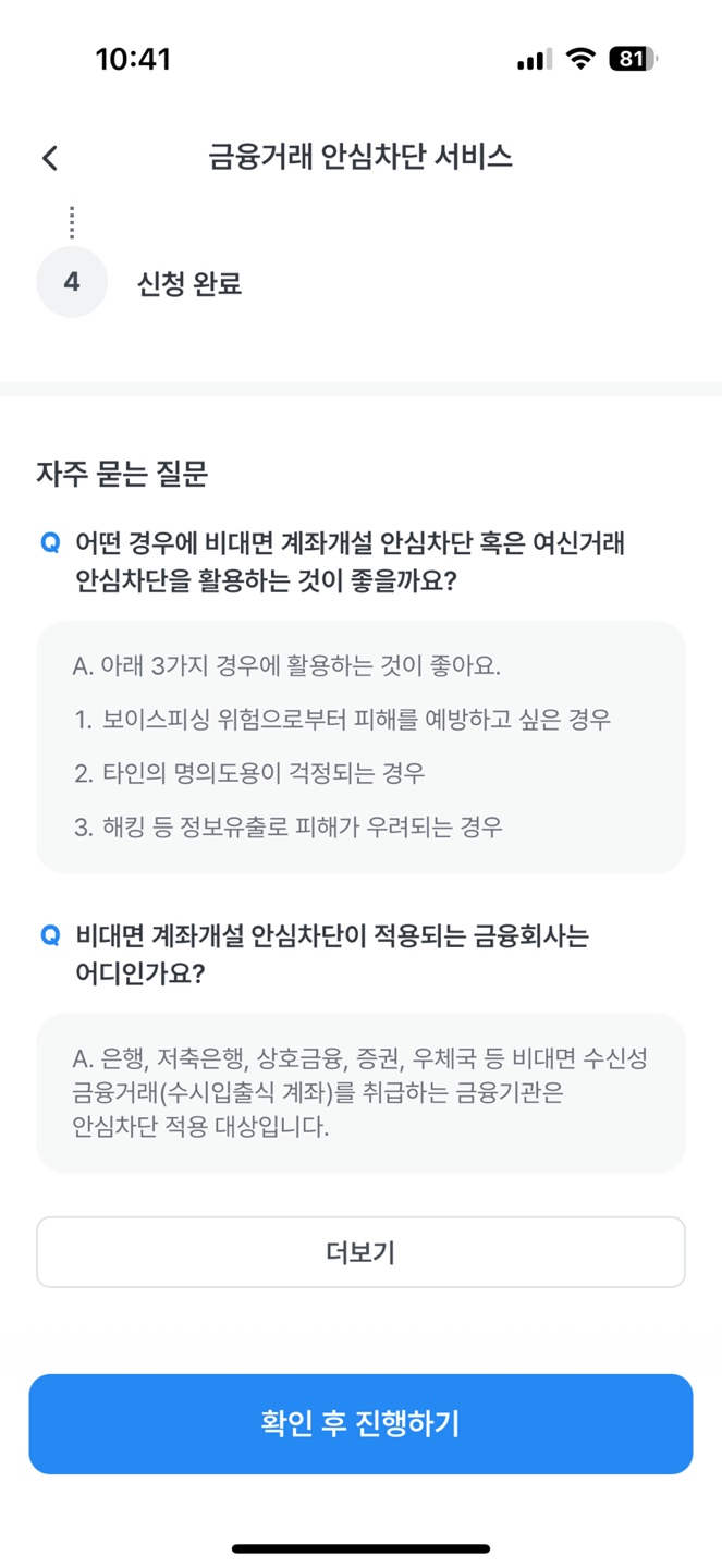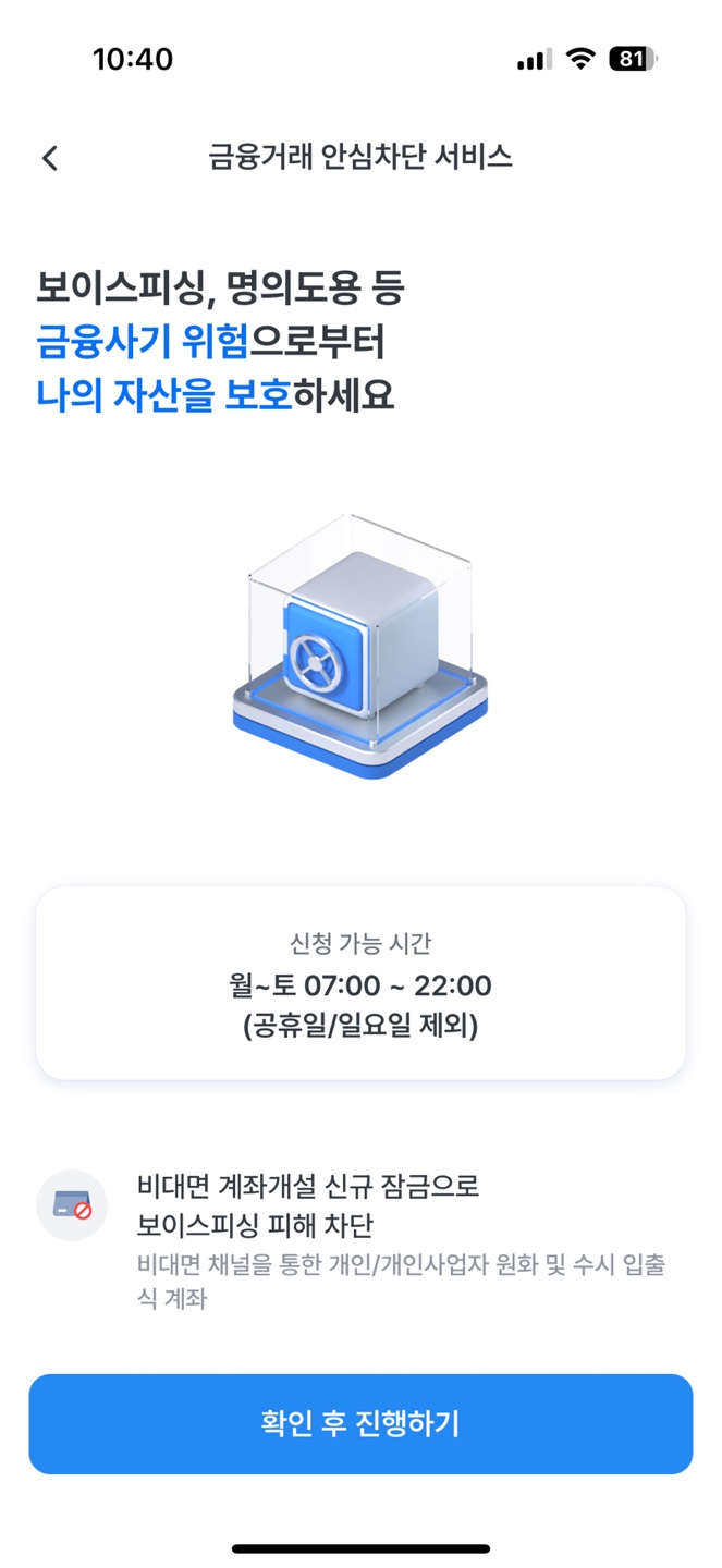2) 금융 거래 안심차단 서비스에 대한 설명이 나오면 "확인 후 진행하기" 버튼을 눌러 다음으로 넘어갑니다.