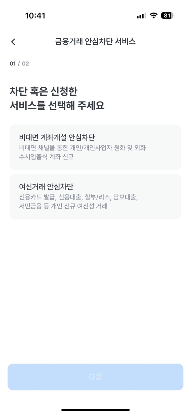 3) 비대면 계좌개설 안심차단, 여신거래 안심차단 두가지 서비스가 보입니다.