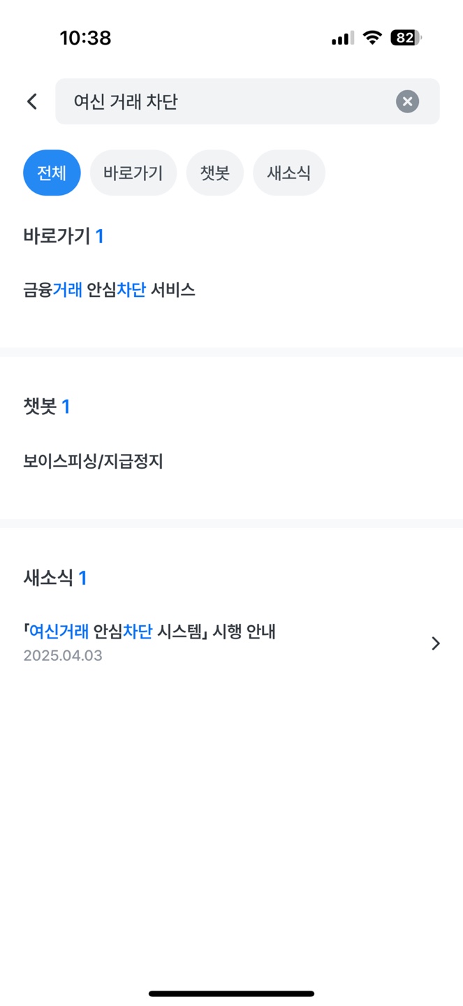 1) 우리 은행 앱을 실행한 후 검색창을 열어 "여신 거래 차단" 또는 "차단"이라는 검색어를 넣어줍니다.