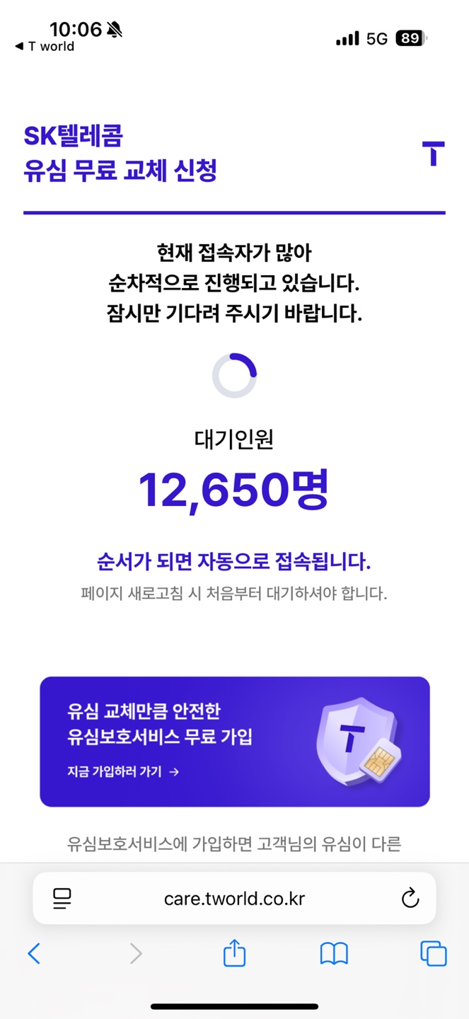 조금 늦게 들어갔더니 대기 인원이 엄청 몰려 겨우겨우 기다려 유심 무료 교체 신청을 했는데 언제쯤 유심이 들어올지 전혀 알 길이 없어 답답합니다.