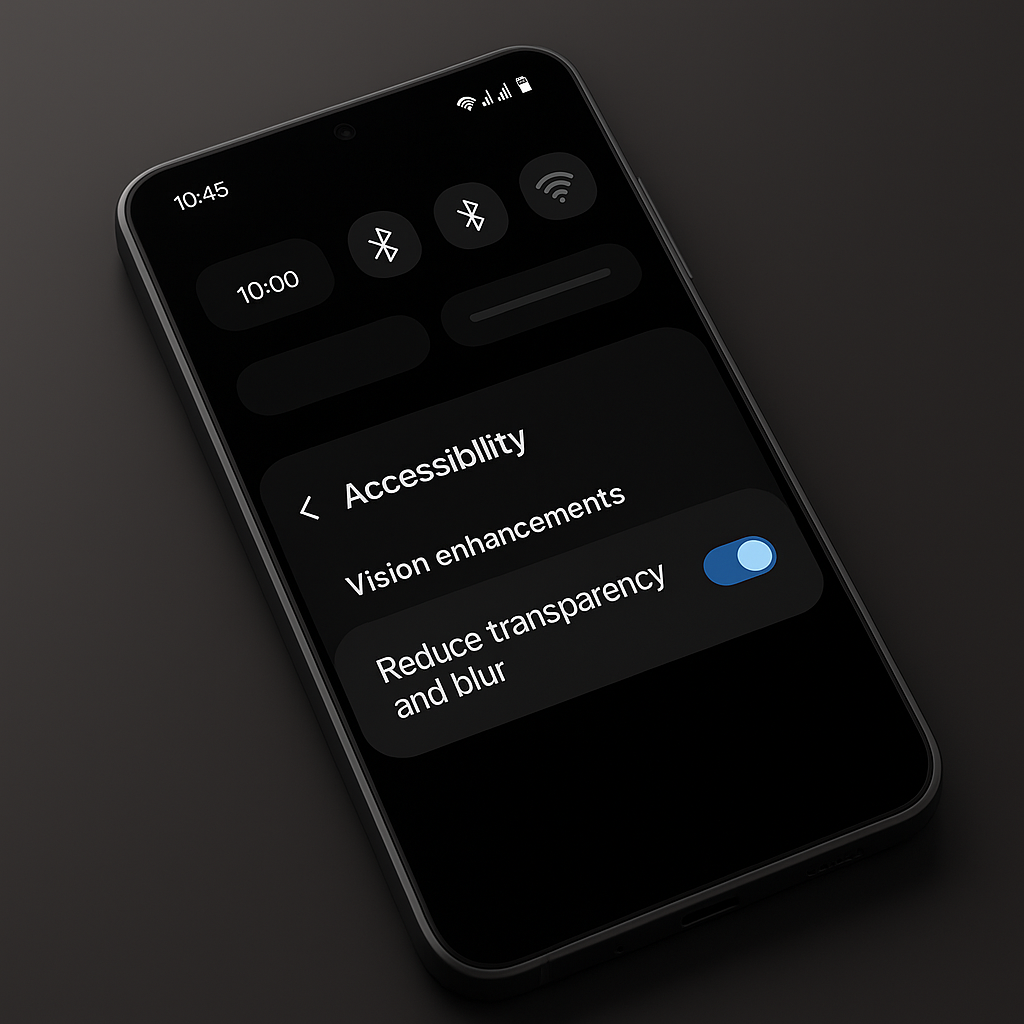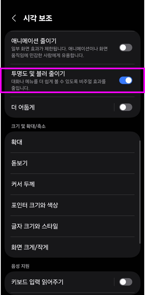 ① 설정 > 접근성 > 시각 보조 > 투명도 및 블러 줄이기 옵션이 켜져 있음