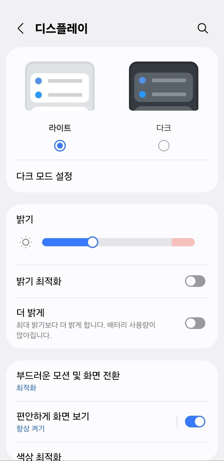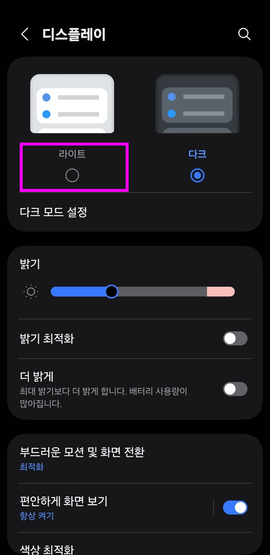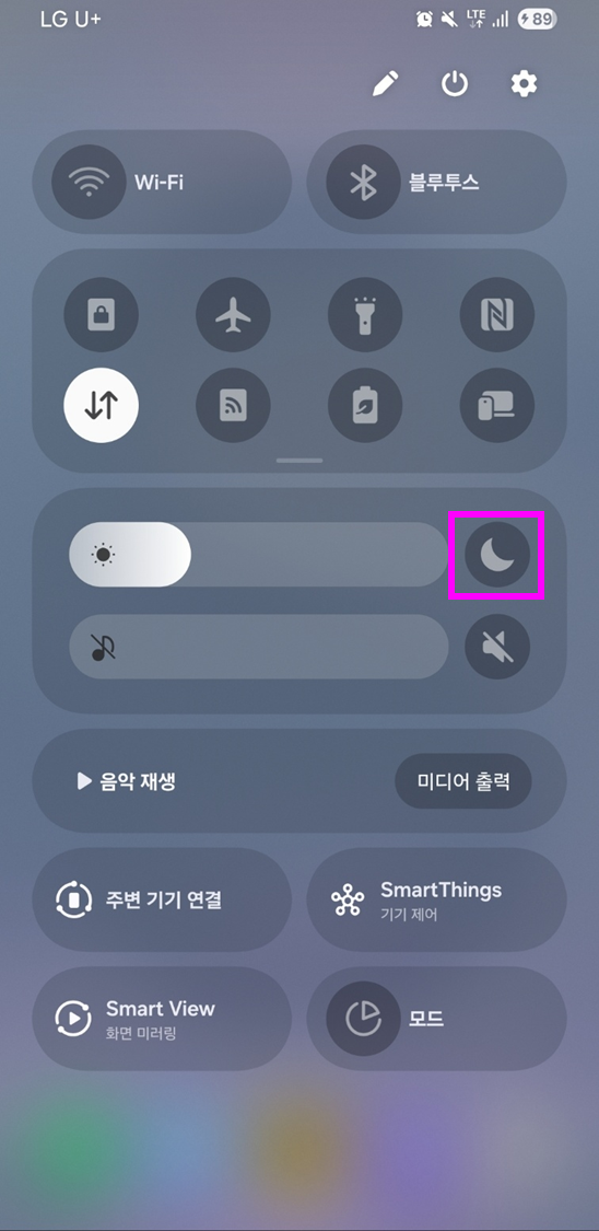 또는 빠른 설정창의 다크모드 아이콘을 눌러 설정을 변경할 수 있습니다.