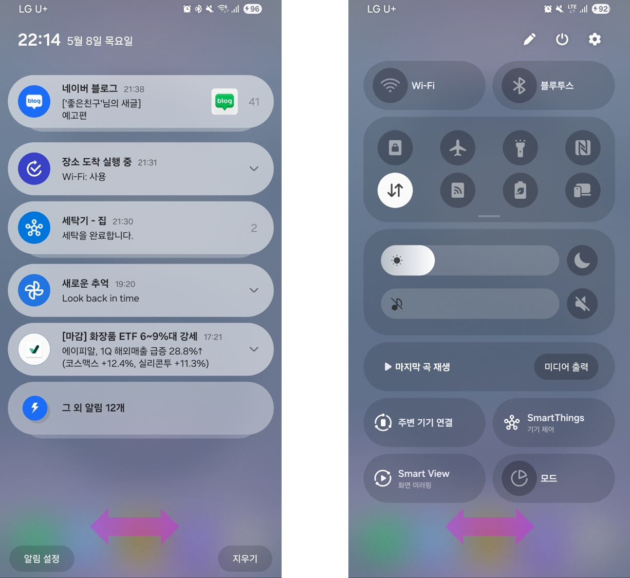 빠른 설정창과 알림창은 빈공간을 오른쪽/왼쪽으로 스와이프해서 이동이 가능합니다.