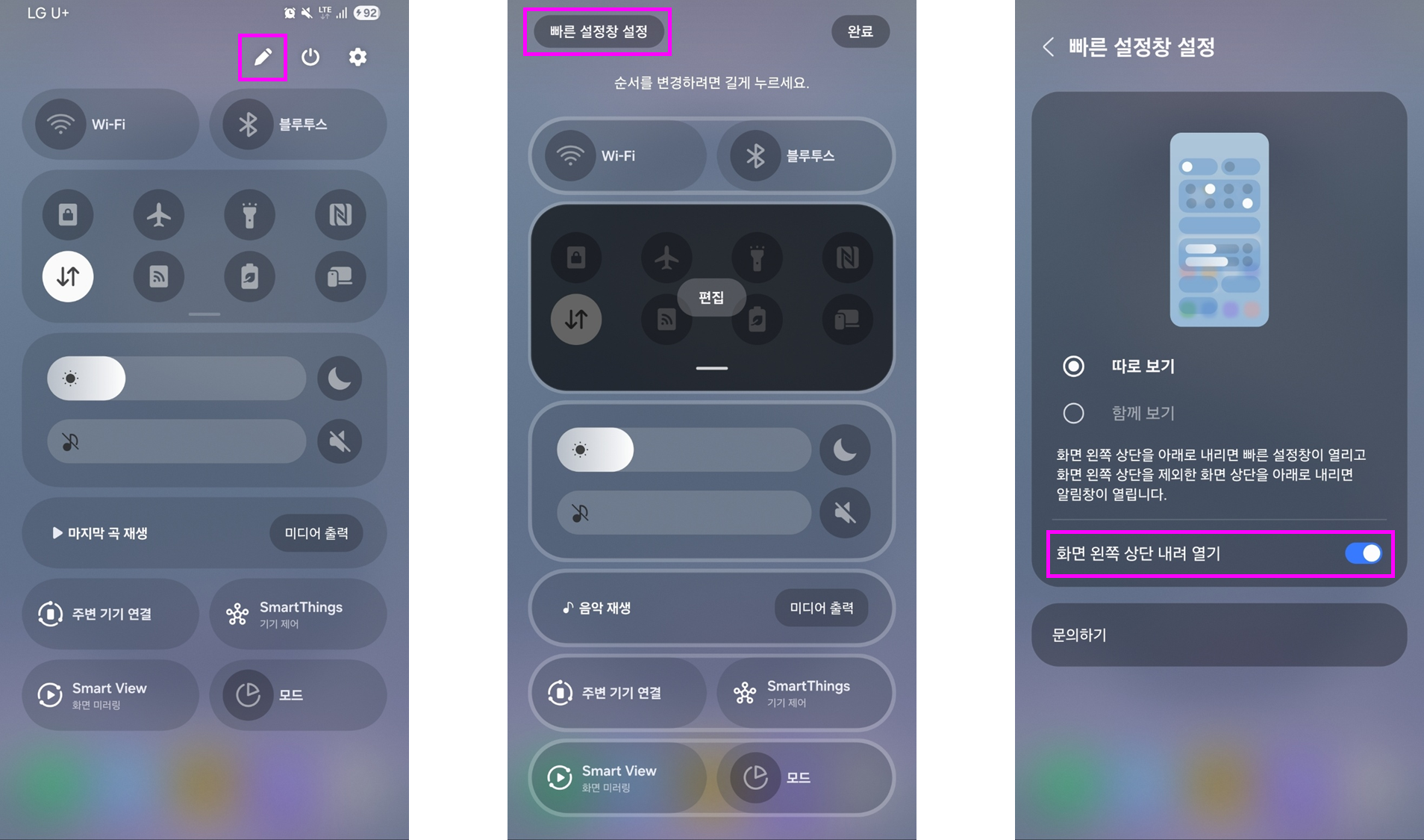 왼쪽 상단에서 빠른 설정창 열기 설정하는 방법