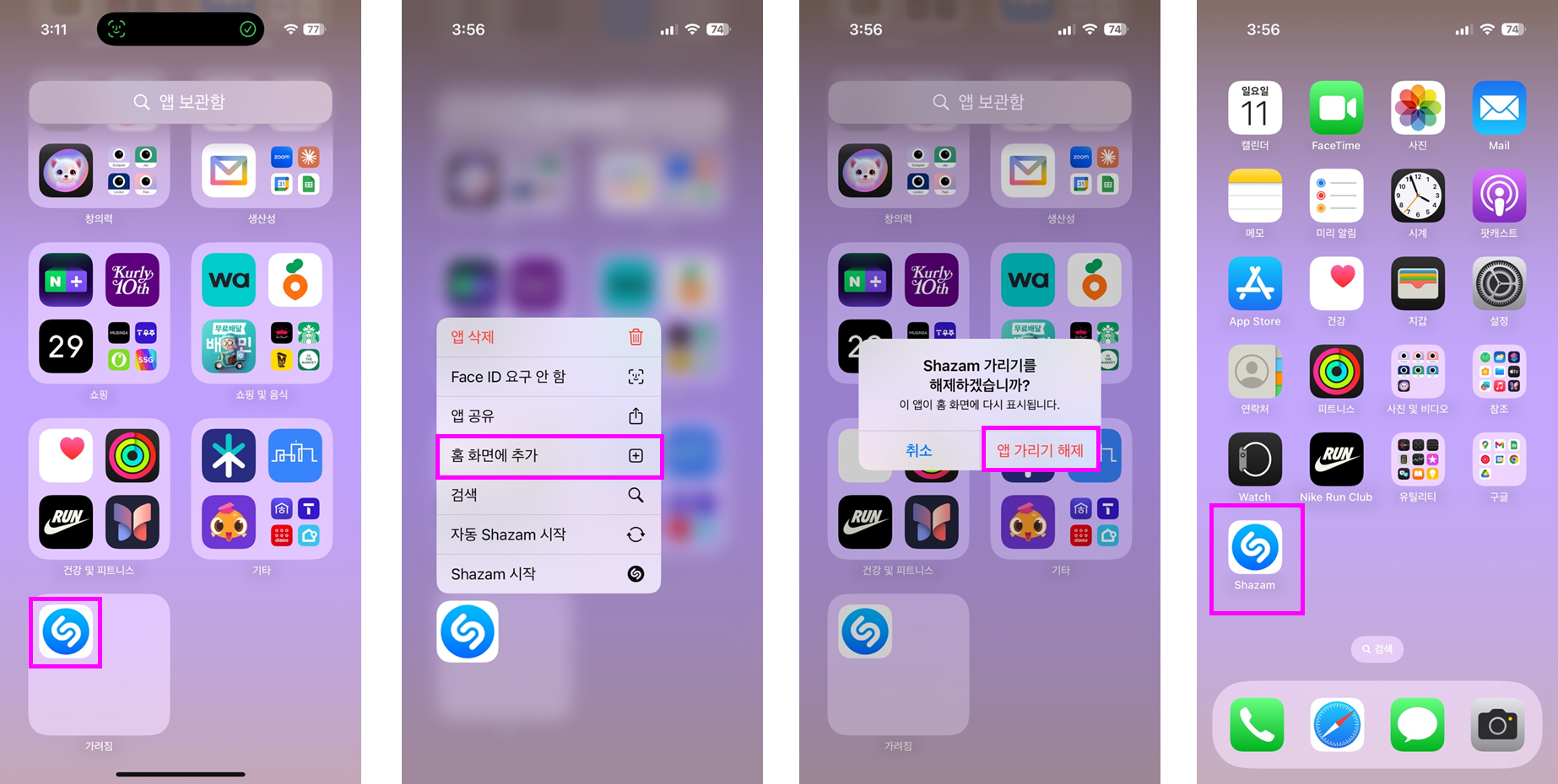 ④ 한 번 더 확인하는 팝업에서 '앱 가리기 해제'를 선택하면 홈 화면에 원하는 앱이 표시되는 것을 알 수 있습니다.