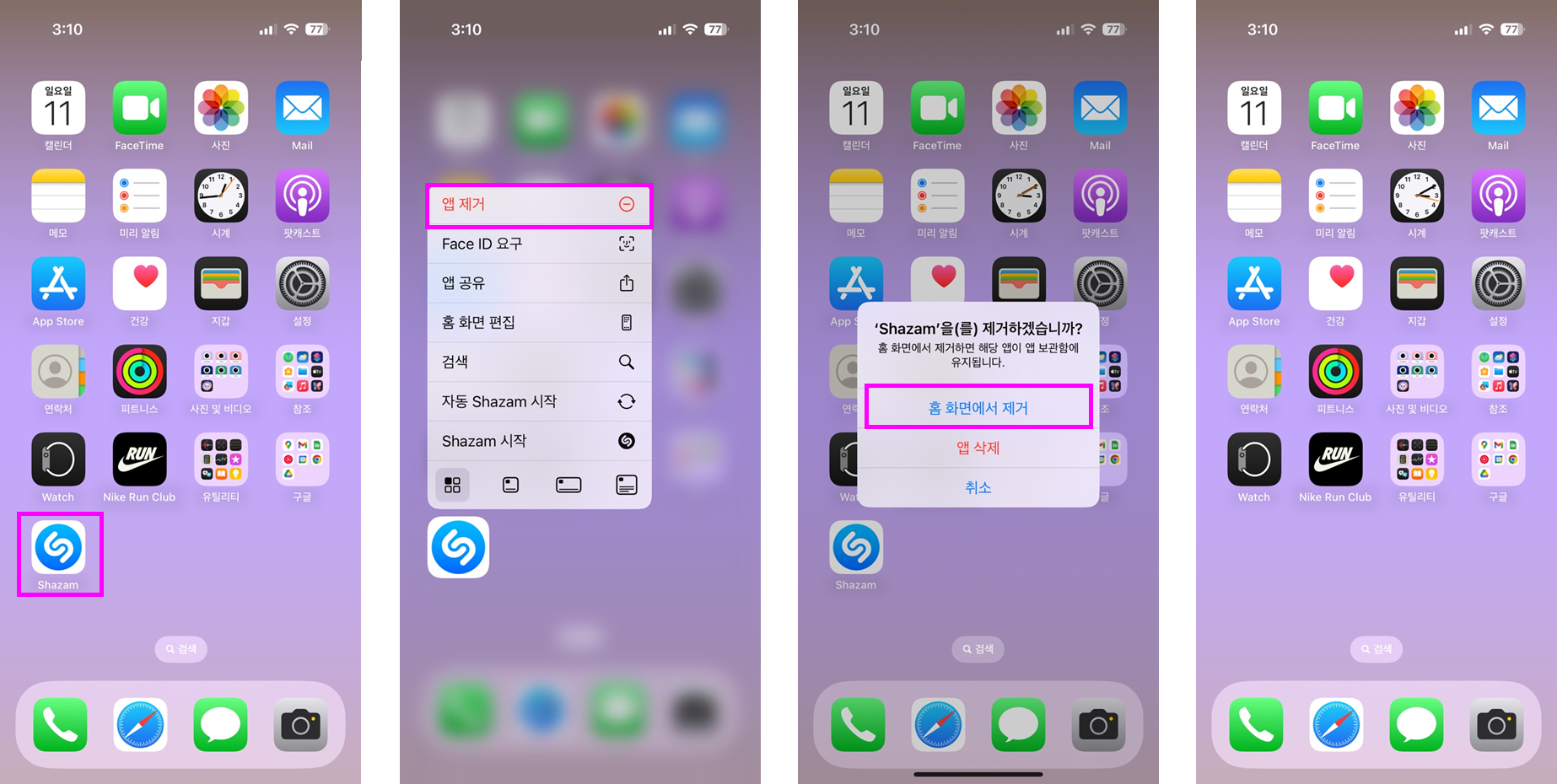 ③ 홈 화면에서 제거를 선택합니다.
