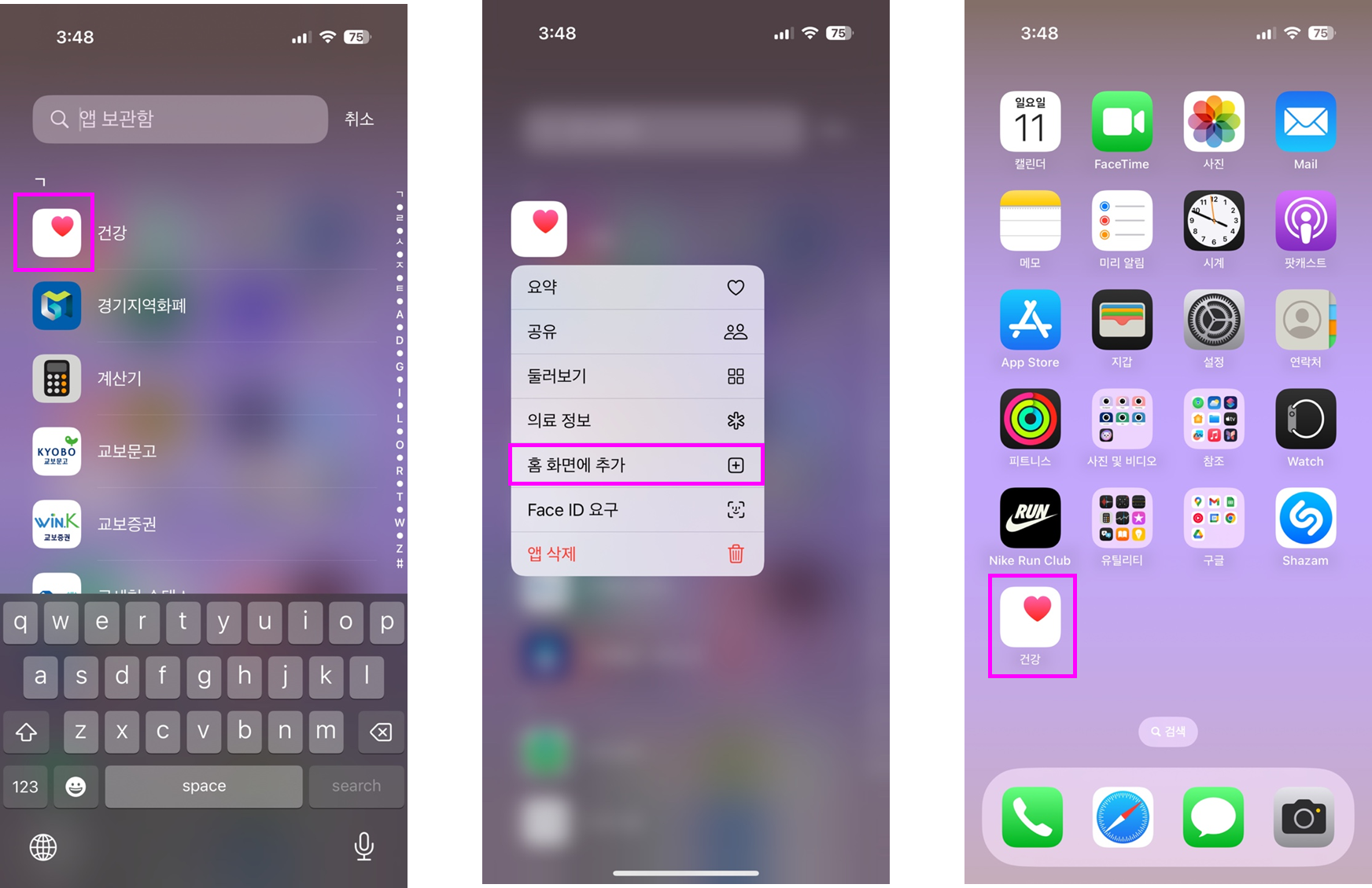 홈 화면에서 숨겨진 모습을 볼 수 있으며, 앱을 실행하고 싶으면 앱 보관함에서 확인 가능합니다.