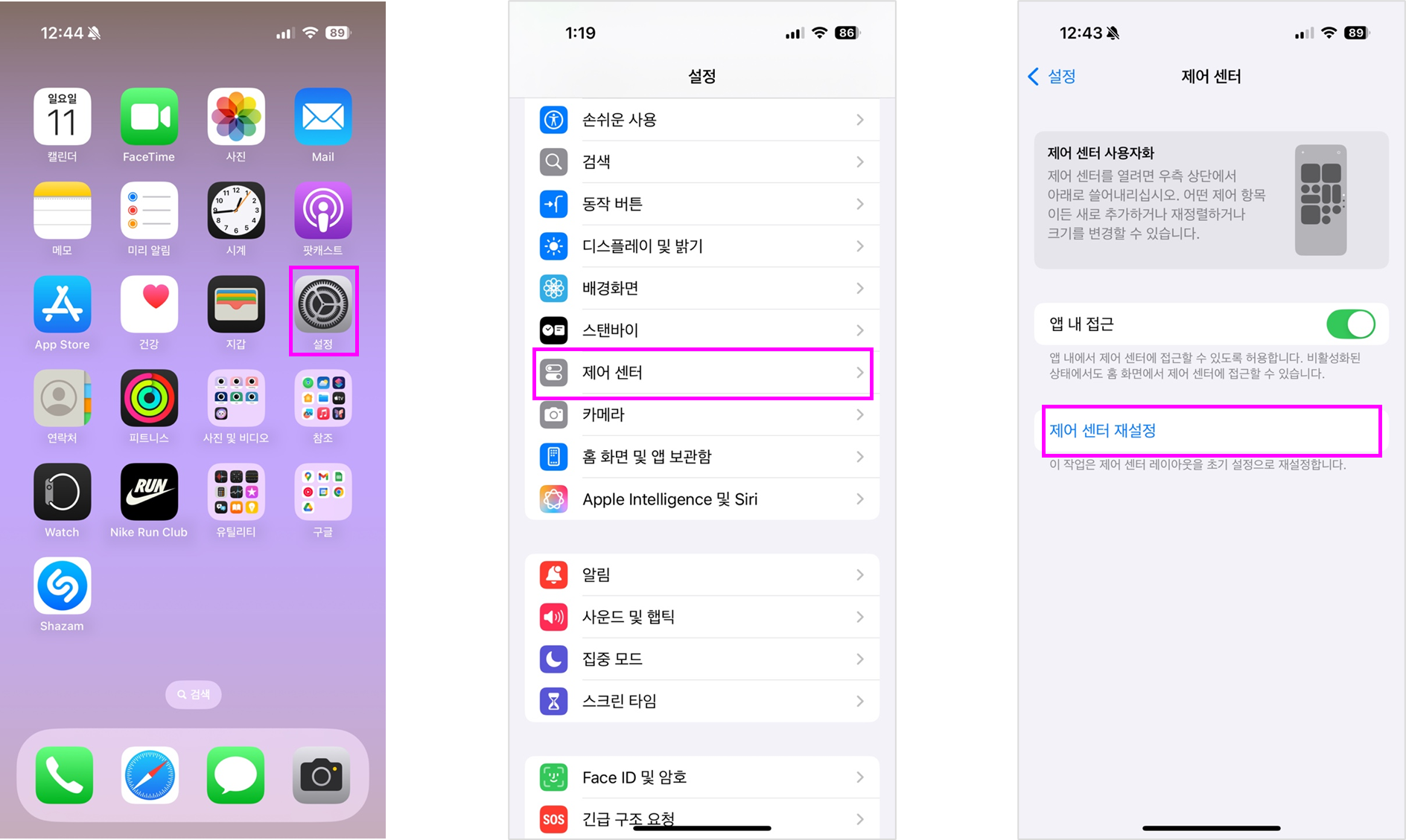 설정 경로 : 설정 > 제어 센터 > 제어 센터 재설정