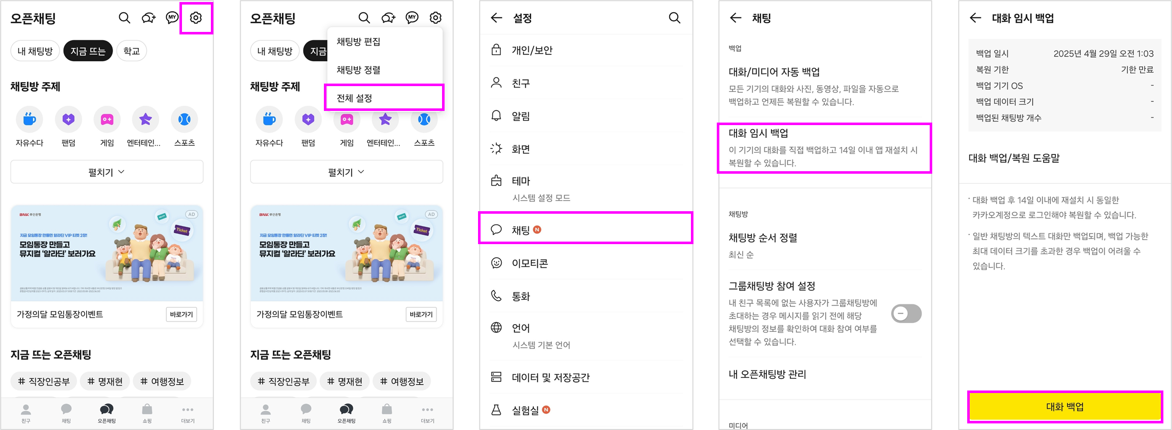 ② 오른 쪽 상단 '설정(⚙)' 버튼 → '전체 설정' → '채팅' → '대화 임시 백업' 선택