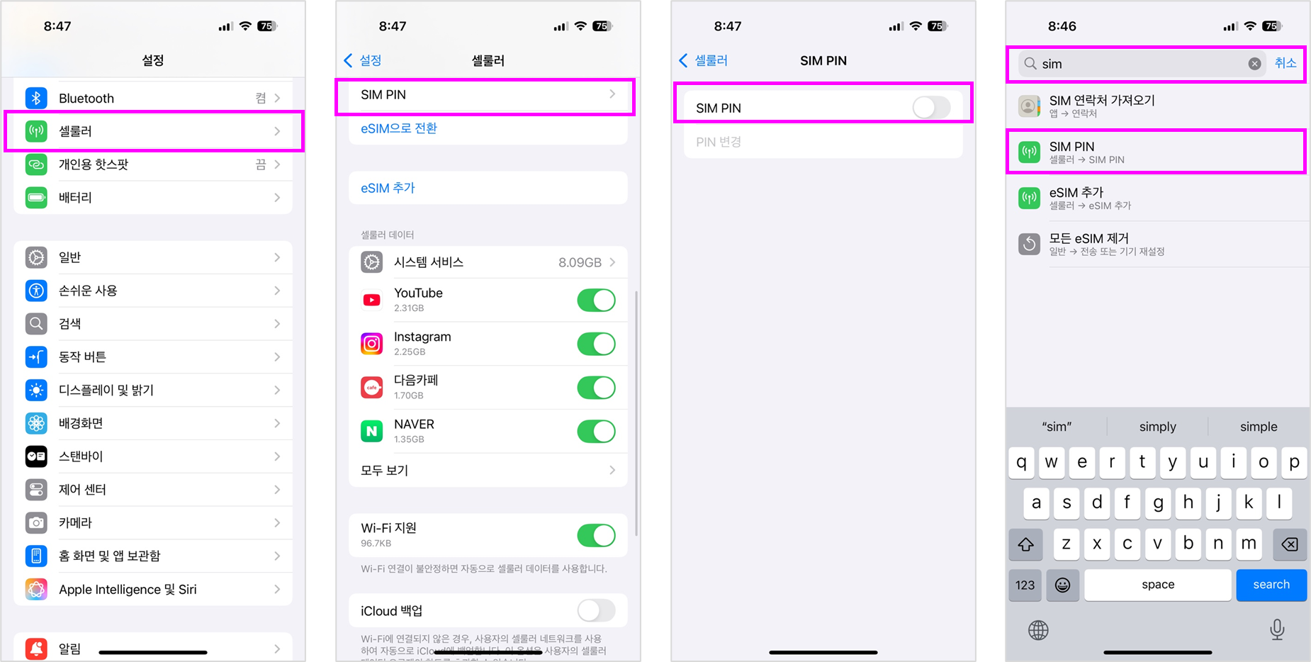 ※ 설정 > 찾기에서 SIM을 입력하면 SIM PIN 메뉴로 바로 갈 수 있습니다 (아래 4번째 이미지)