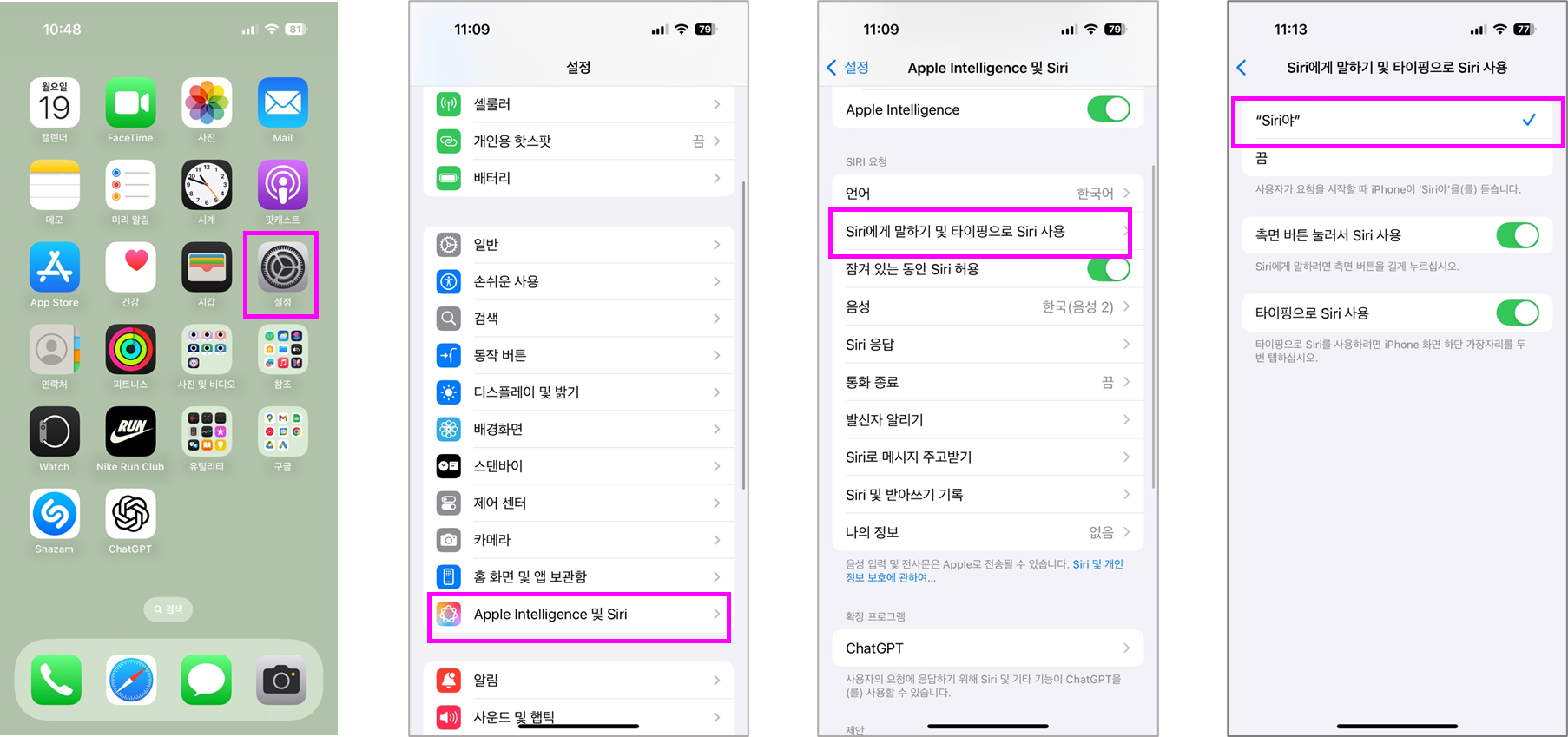 ※ "설정 > Apple Intelligence > Siri에게 말하기 및 타이핑으로 Siri 사용"에 들어가시면 Siri 음성 호출이 "Siri야"로 되어 있는지 확인하세요.