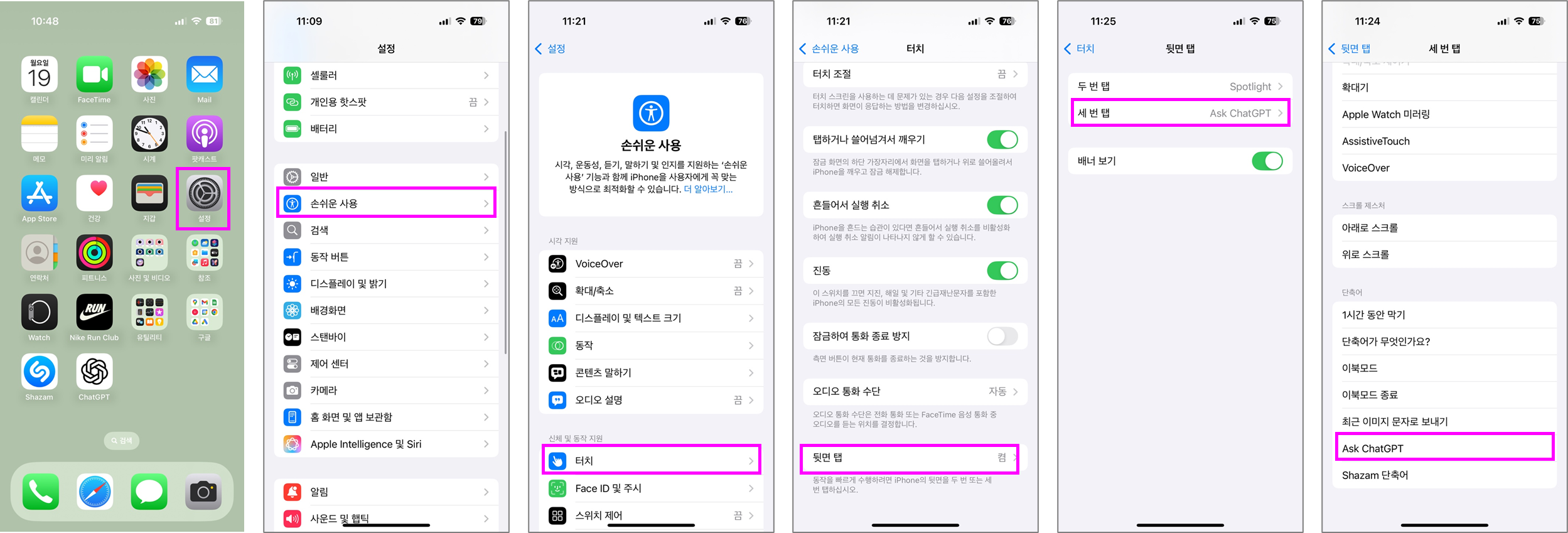 '단축어(Shortcuts)'와 뒷면 탭을 활용하여 챗GPT를 더 빠르게 호출할 수 있습니다.