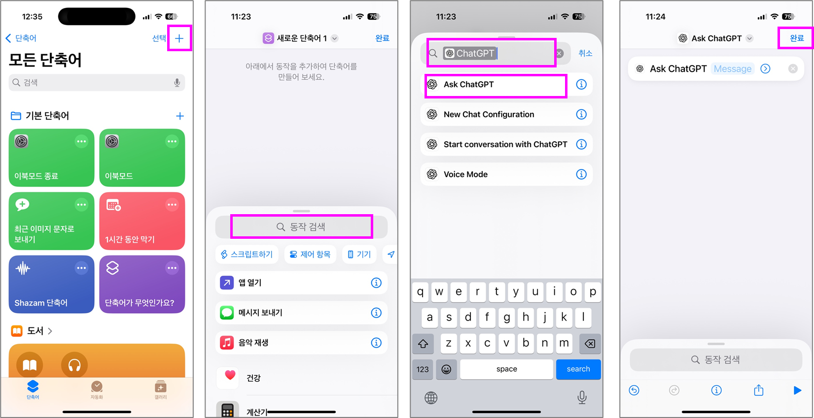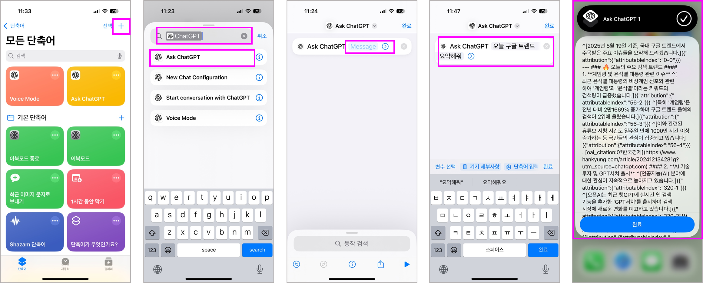 단축어 → '+' > "ChatGPT 검색" → Message에 "오늘 구글 트렌드 요약" 명령 추가