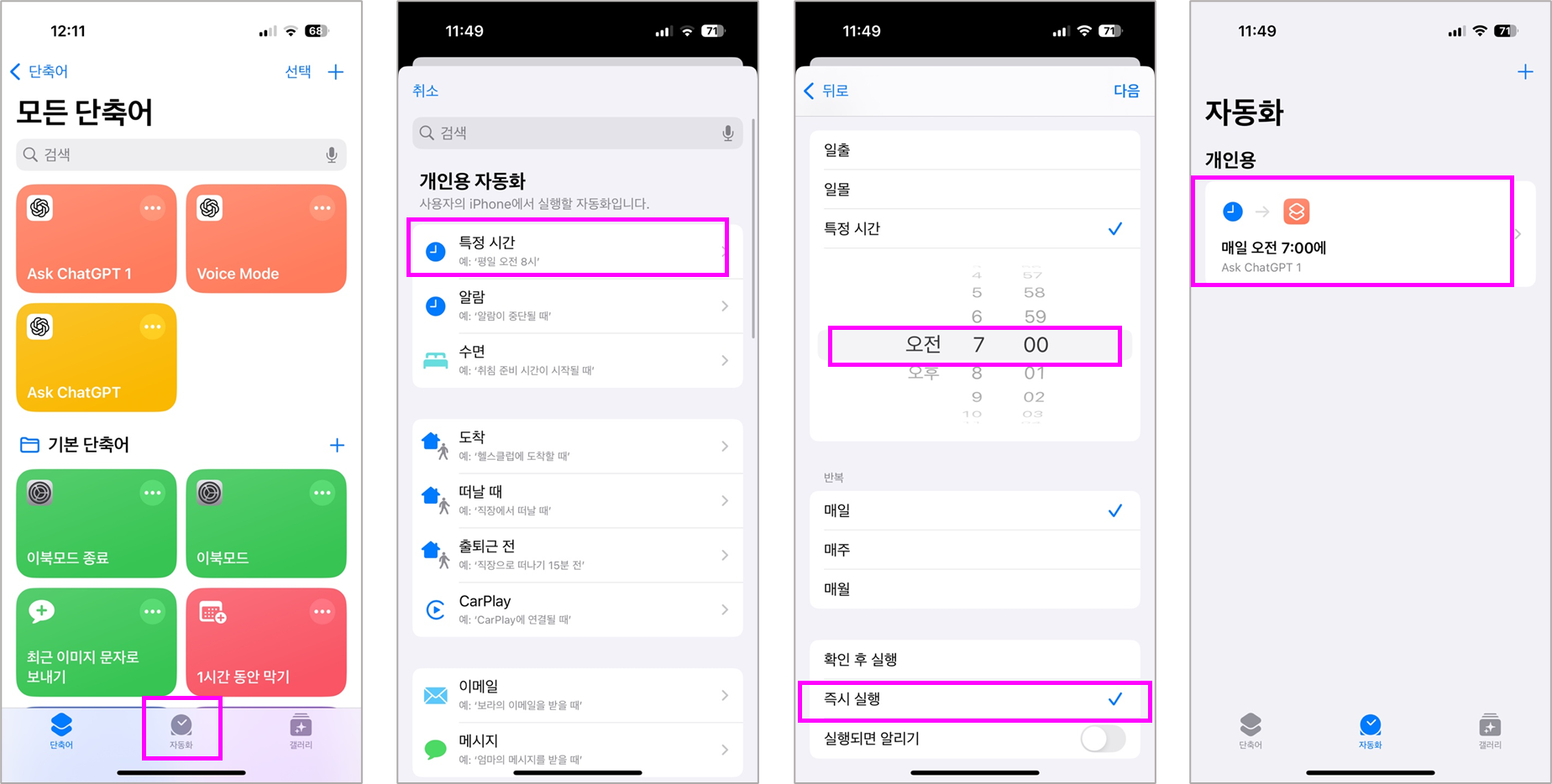 예: 매일 아침 7시에 "오늘의 구글 트렌드 요약해줘"라는 질문을 자동으로 보내는 단축어 설정
