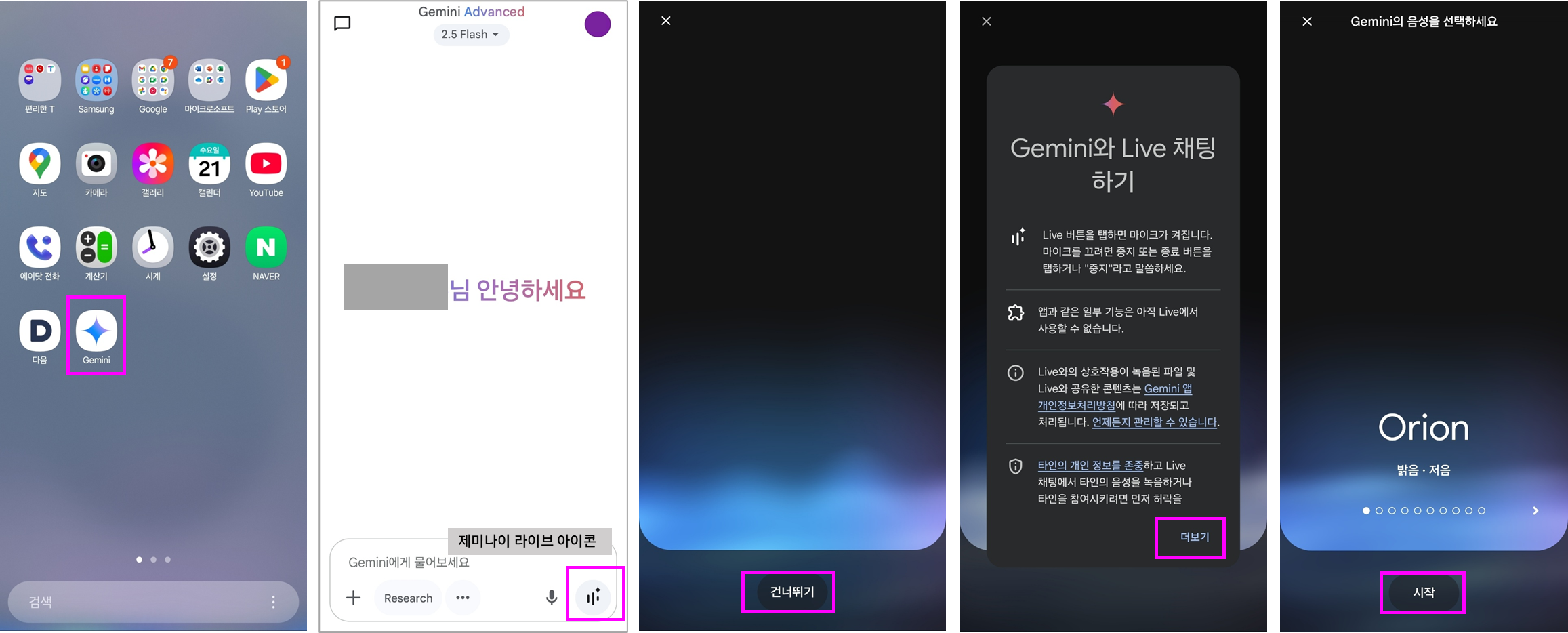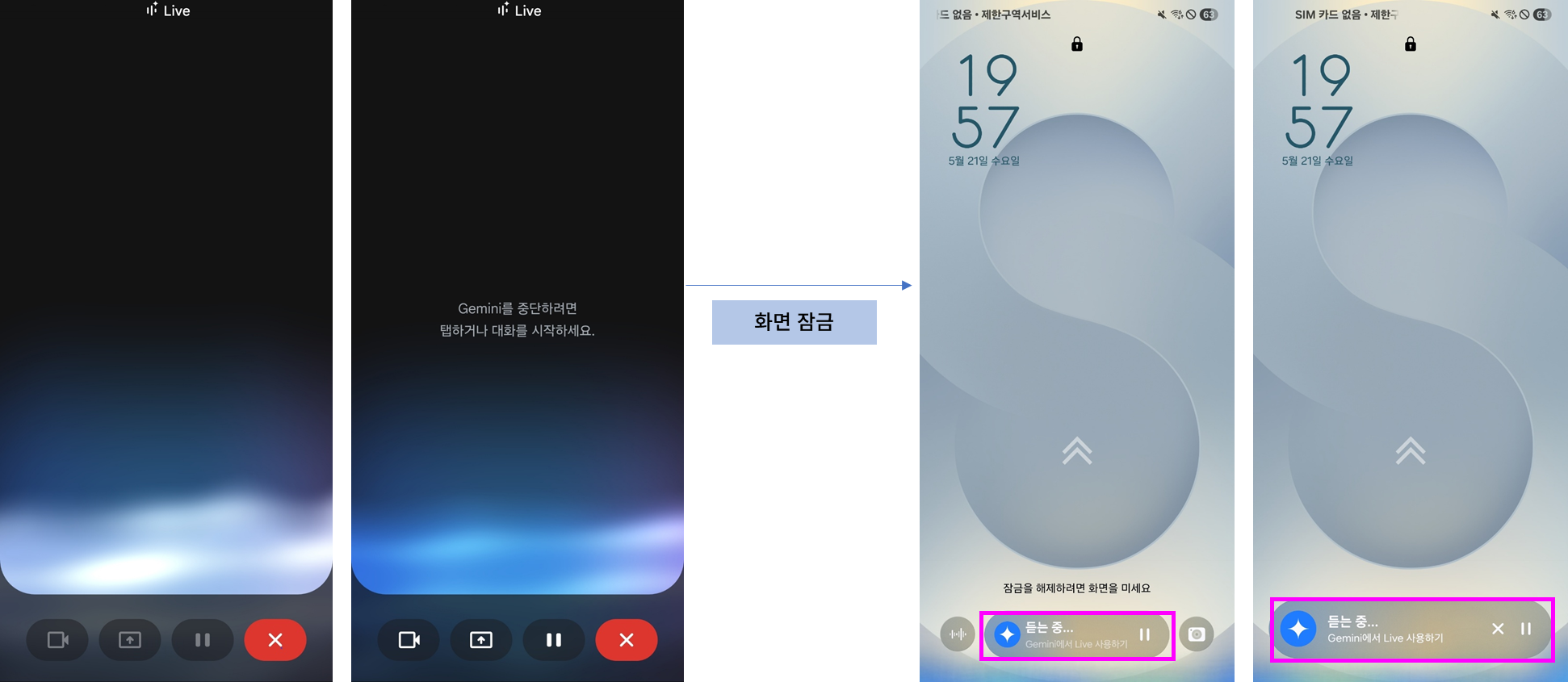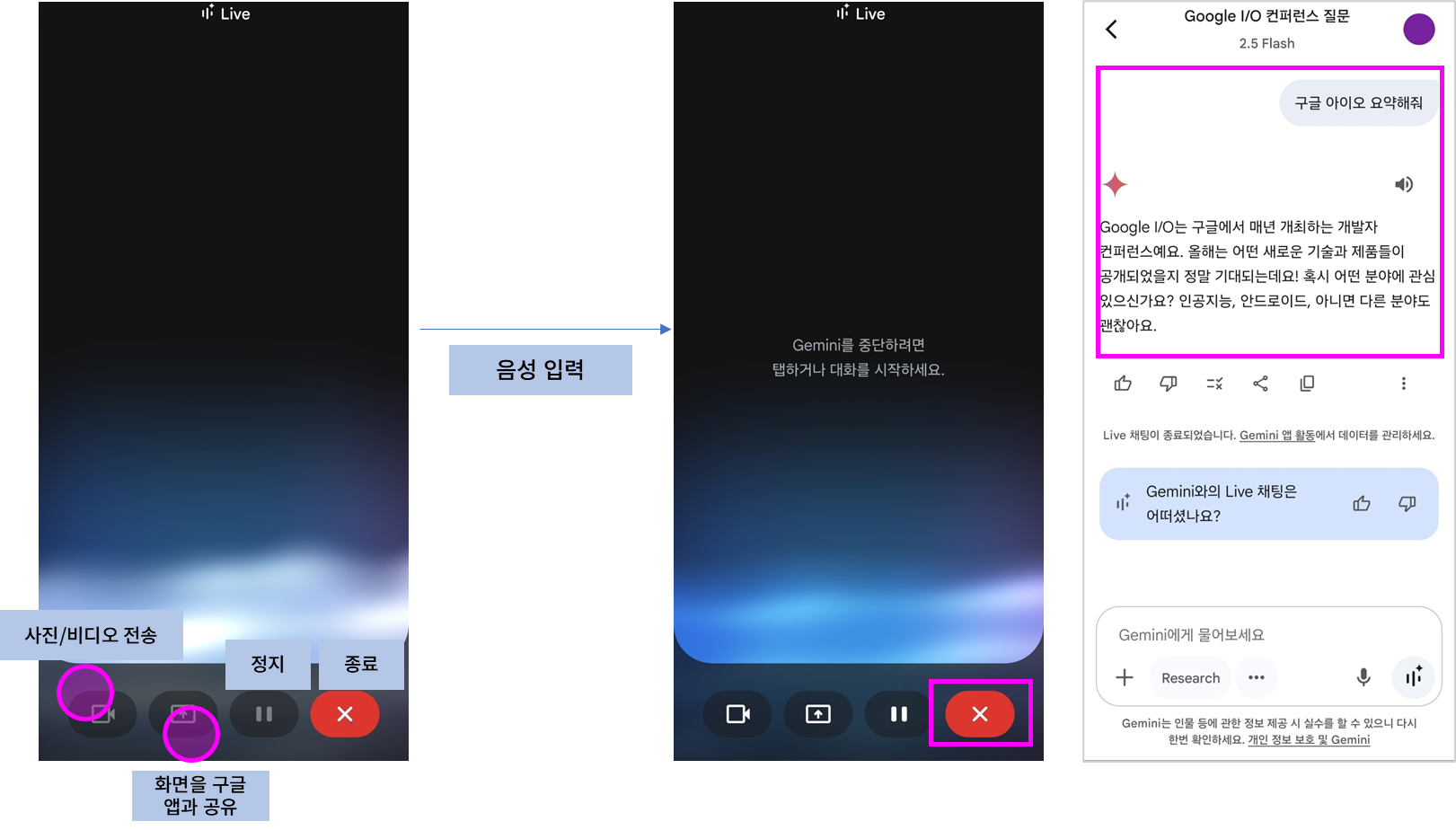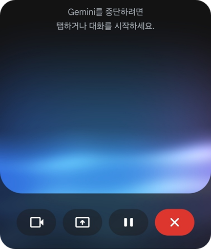 ※ 참고: Gemini Live 하단 버튼은 왼쪽부터 순서대로 '사진/비디오 전송', '화면을 구글 앱과 공유', '대기/정지', '종료' 기능입니다.