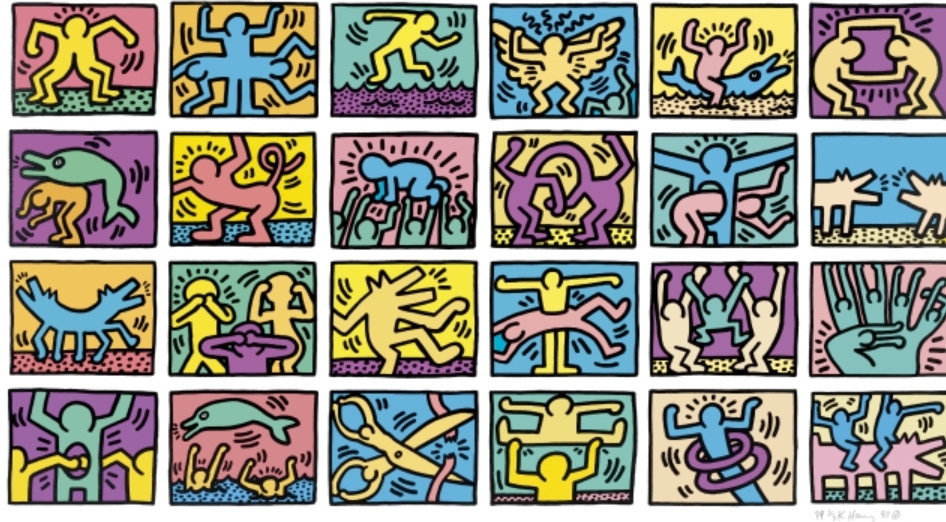 키스 해링의 시그니처 아이콘인 찢는개, 빛나는 아기, 춤추는 사람들 등 24개의 이미지로 구성된 프린트 작품입니다.