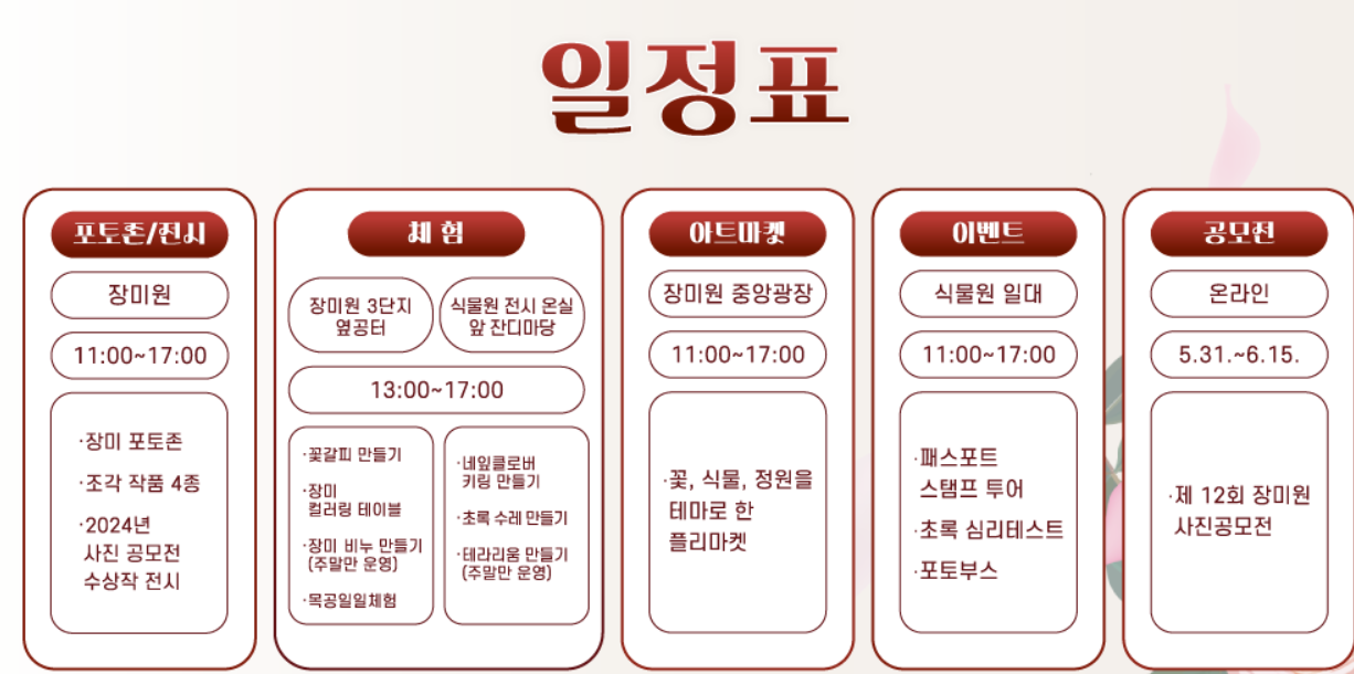 - 포토존/전시: 장미 포토존, 조각 작품 4종, 2024년 사진 공모전 수상작 전시