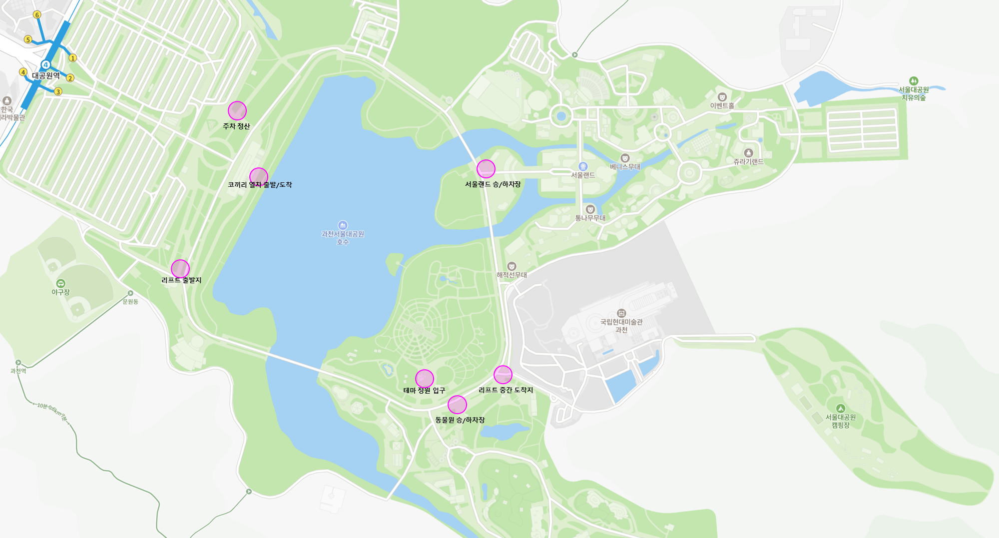 ① 주차장 위치: 서울대공원 주차장, 서울랜드 동문 주차장, 국립현대미술관 주차장 등 총 6,600대 이상 주차 가능합니다.