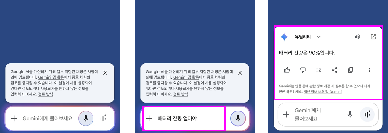 ② 제미나이 (Gemini)가 실행되면 '지금 배터리 얼마야'와 같이 물어보면 음성과 함께 배터리 잔량을 알려줍니다.