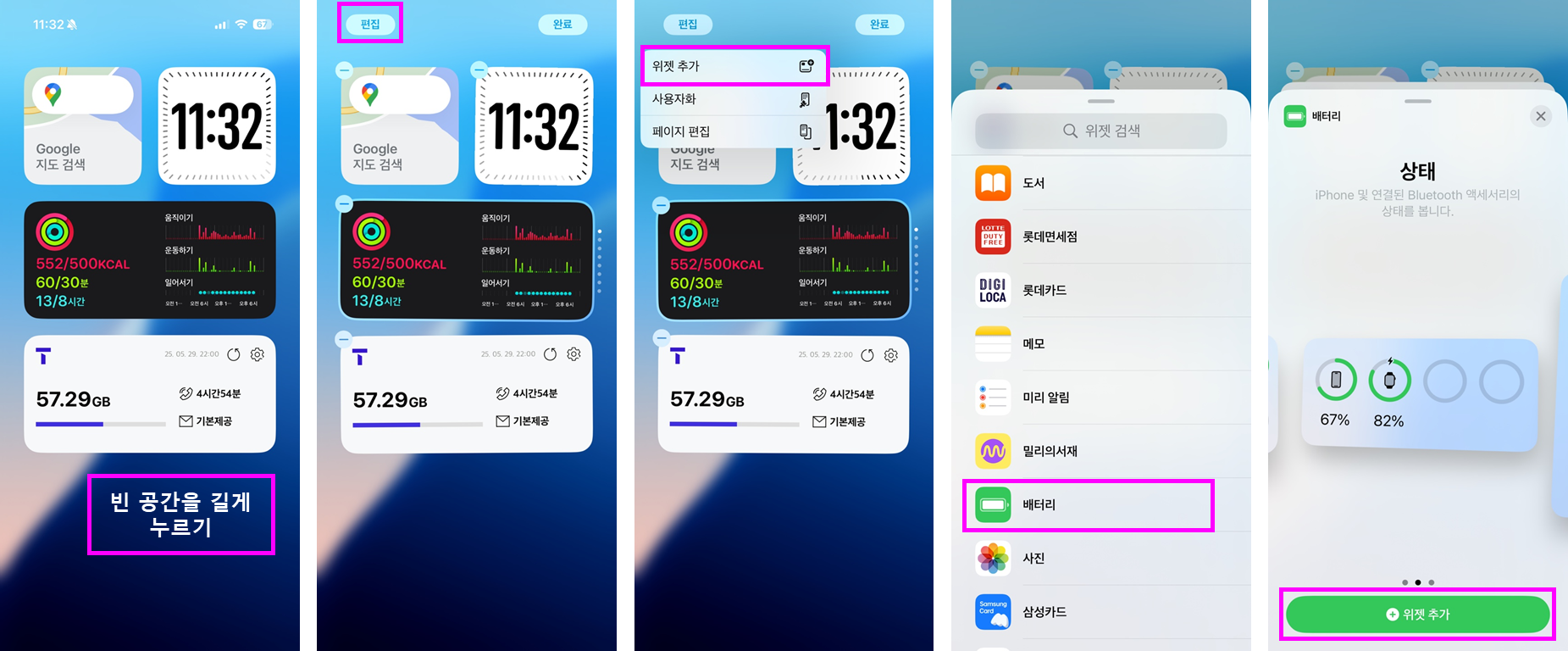 ③ 화면 좌측 상단의 '편집' 버튼을 눌러 '위젯 추가' 메뉴를 선택하여 '배터리' 위젯을 찾아 추가합니다.