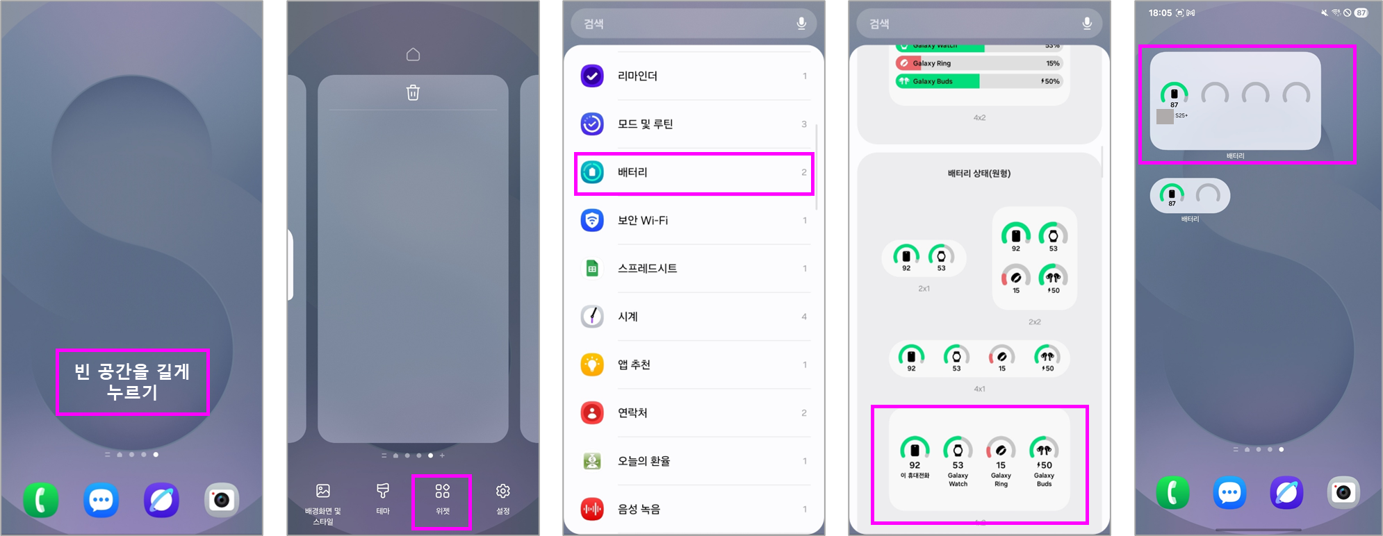 ③ '배터리' 위젯 중 원하는 위젯을 선택하여 길게 눌러주면 원하는 홈 화면 위치에 표시됩니다.