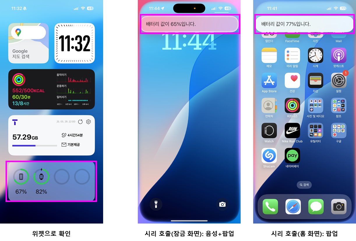 ② ' 배터리 잔량 얼마야?"라고 물어보면 음성 또는 화면 상의 팝업으로 배터리 잔량 확인이 가능합니다.