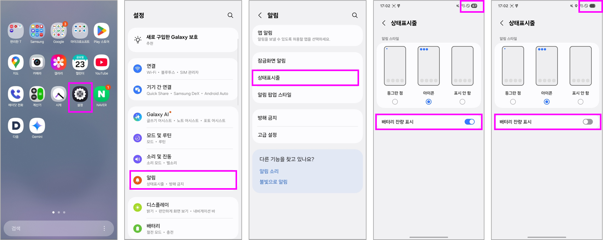 One UI 버전에 따라 메뉴 위치가 조금씩 다를 수 있어요. 설정에서 '상태표시줄' 또는 '배터리 표시'를 검색해보세요. - 갤럭시/아이폰에서 배터리 퍼센트가 갑자기 사라졌어요.