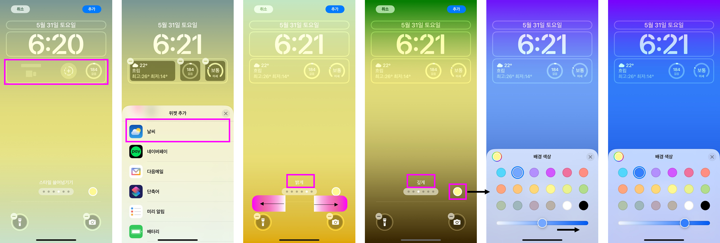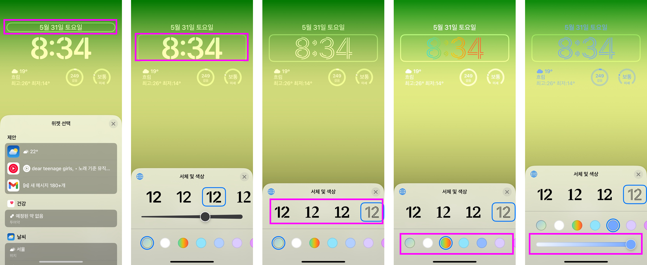 A. 네! 잠금화면 배경화면 편집 시 위젯 추가/삭제, 시계, 폰트, 색상 변경도 가능합니다.