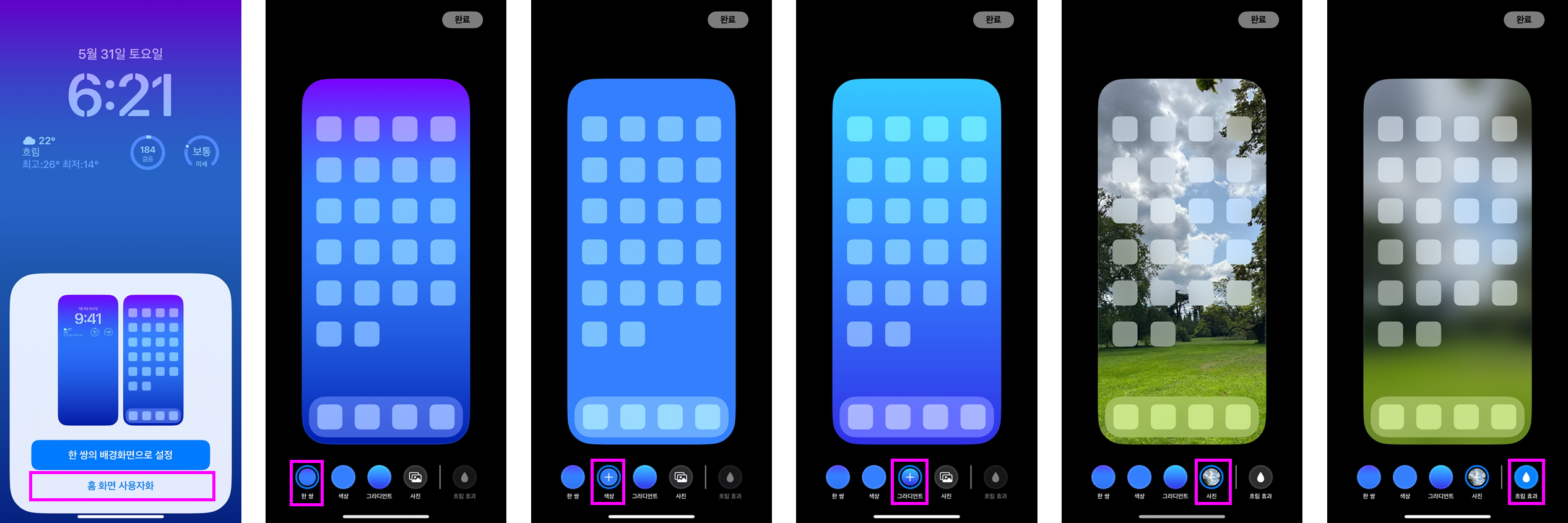 ⑤ 배경화면에 위젯을 추가하거나, 배경화면 타입별로 배경 화면 색상을 변경하거나 톤을 바꿀 수 있습니다.
