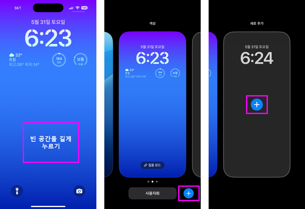 ① 잠금화면에서 빈 공간을 길게 눌러 배경화면 사용자화 메뉴에 들어갑니다.