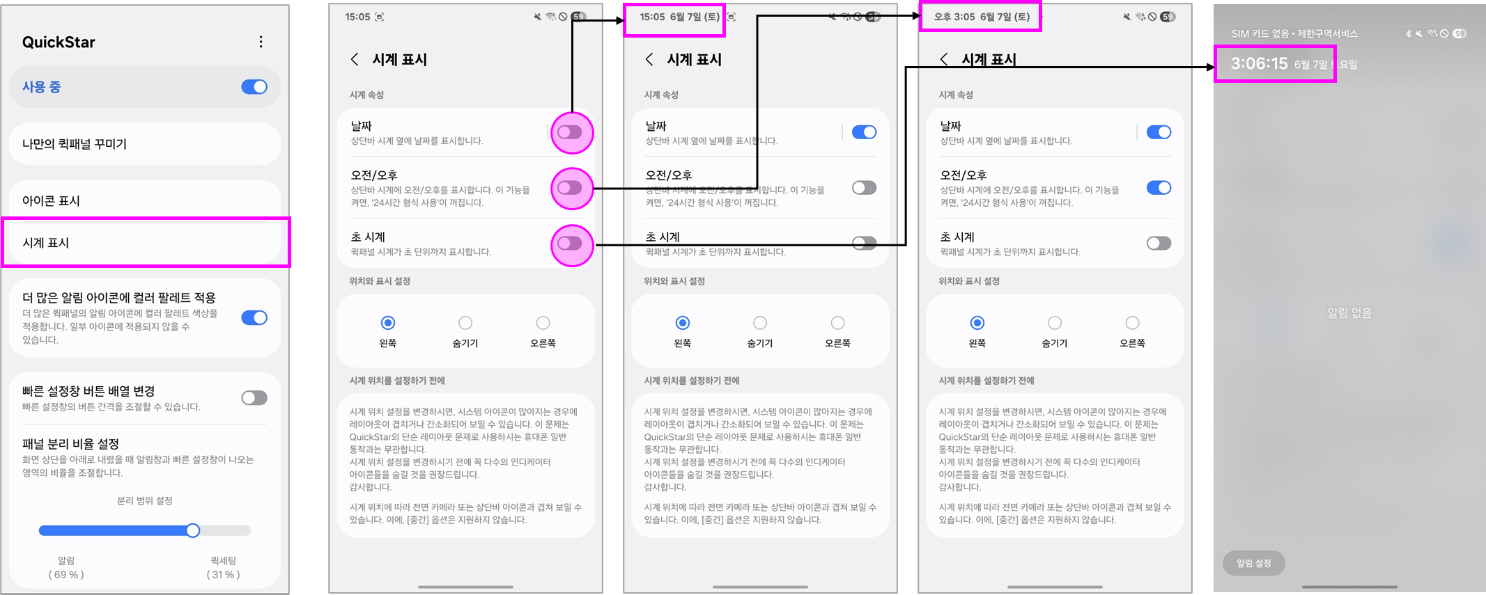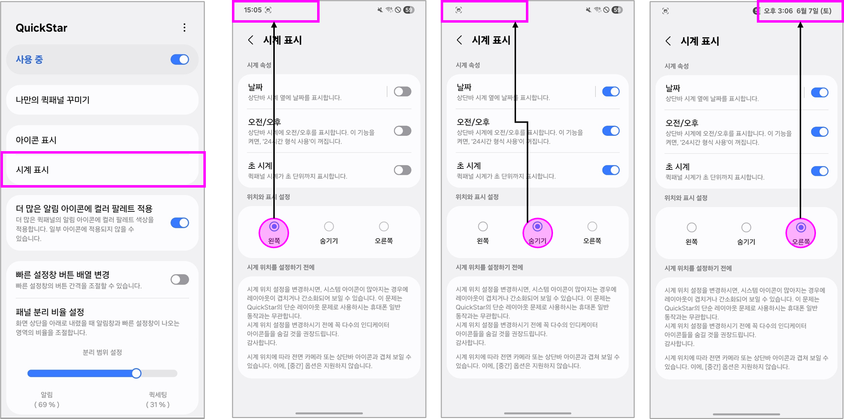 ② 시계 위치를 왼쪽/오른쪽으로 이동하거나 아예 숨길 수 있습니다.