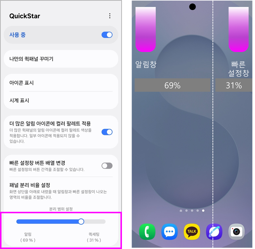 알림창과 빠른설정창의 표시 영역도 분리 설정 가능해 효율적인 알림 관리가 가능합니다.