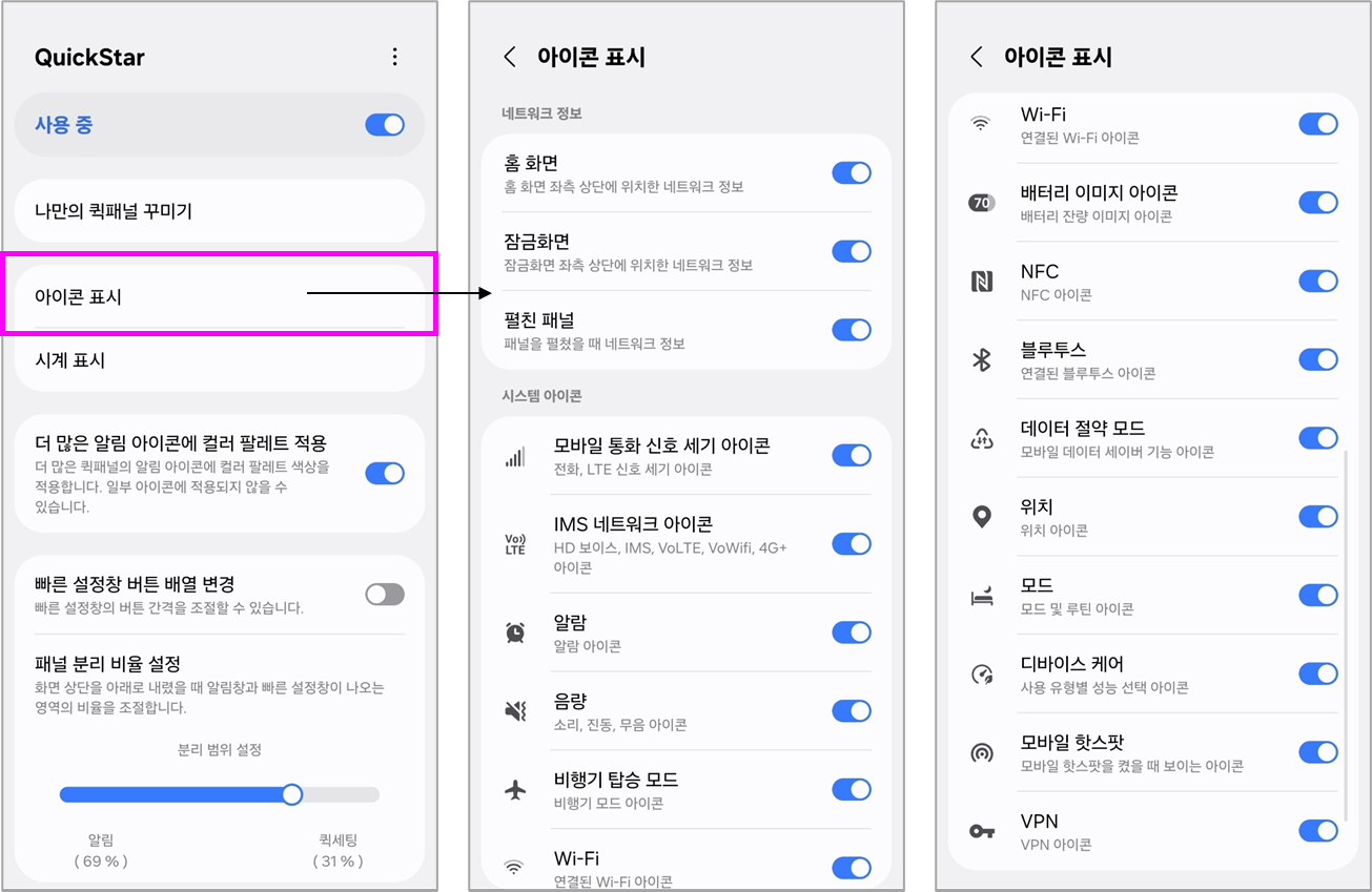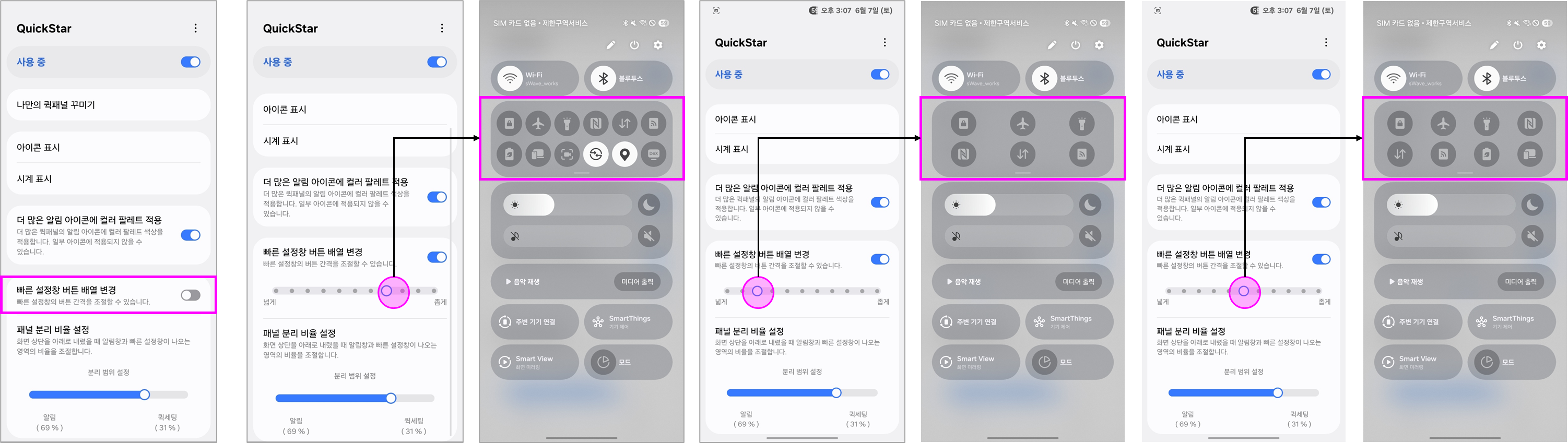 - 빠른설정창 배열 확장: 배열을 넓게 설정해 자주 쓰는 기능을 한 번에 확인할 수 있습니다.