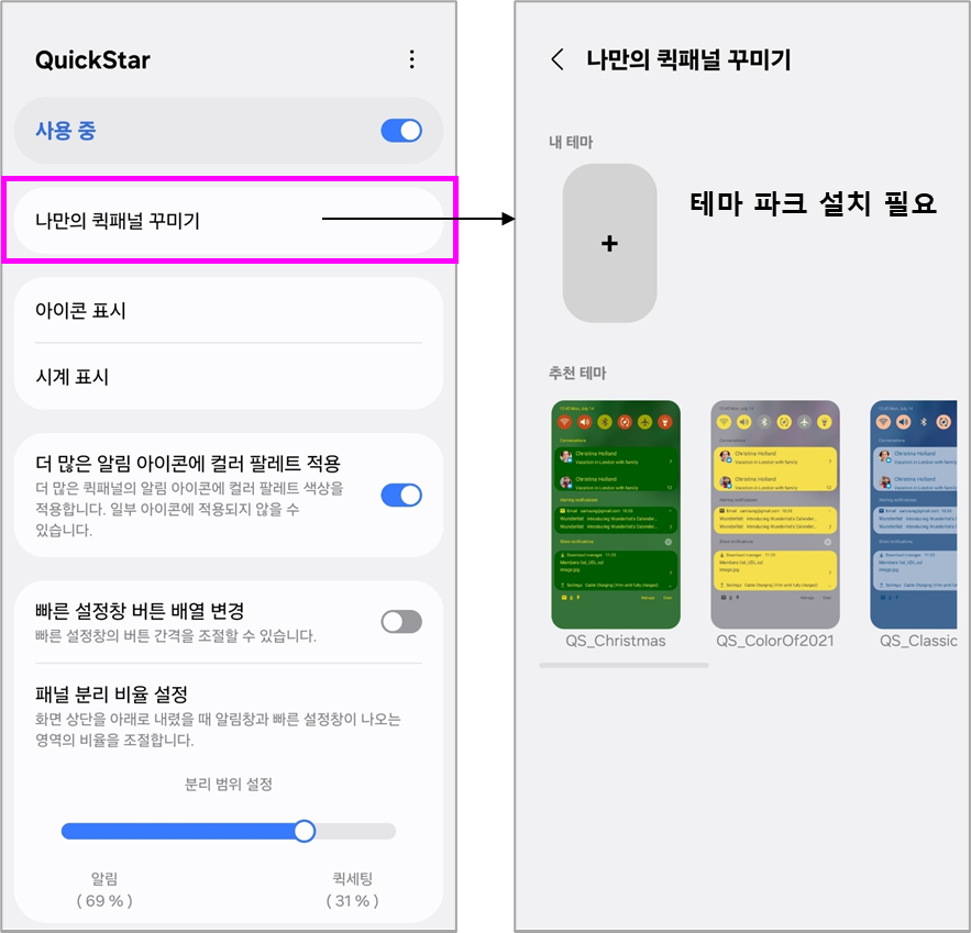 ② 테마파크와 연동해 퀵패널 색상, 투명도, 테마까지 자유롭게 커스터마이징 가능합니다.