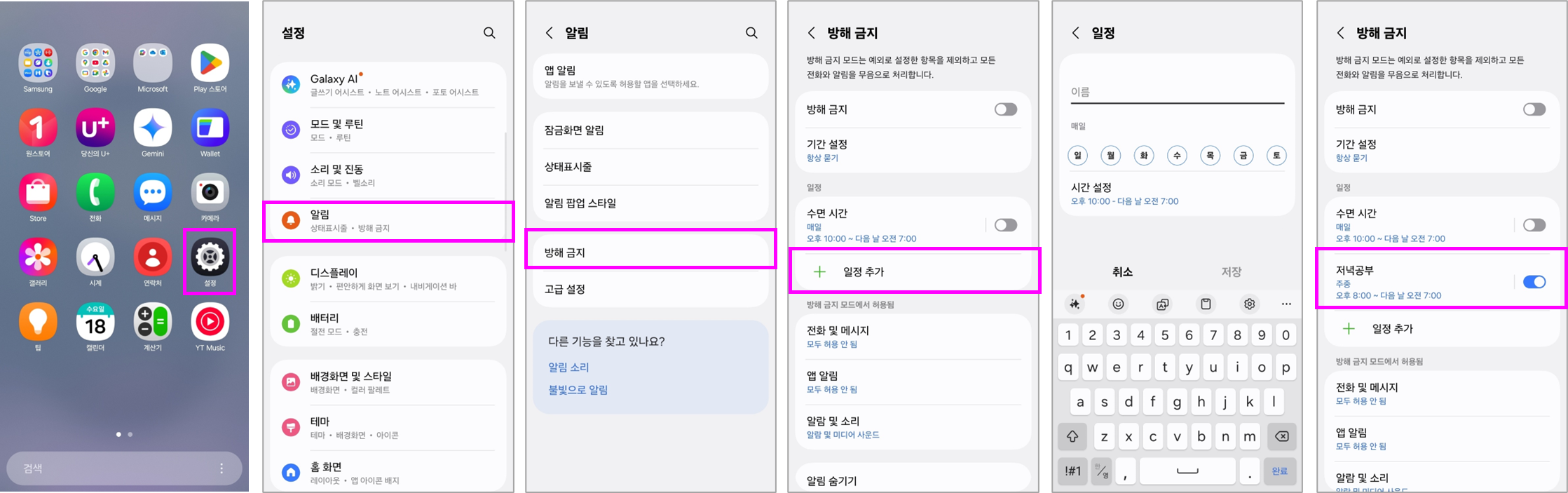 설정 → 알림 → 방해 금지 → 일정 추가를 통해 원하는 시간에 방해 금지를 설정할 수 있습니다.